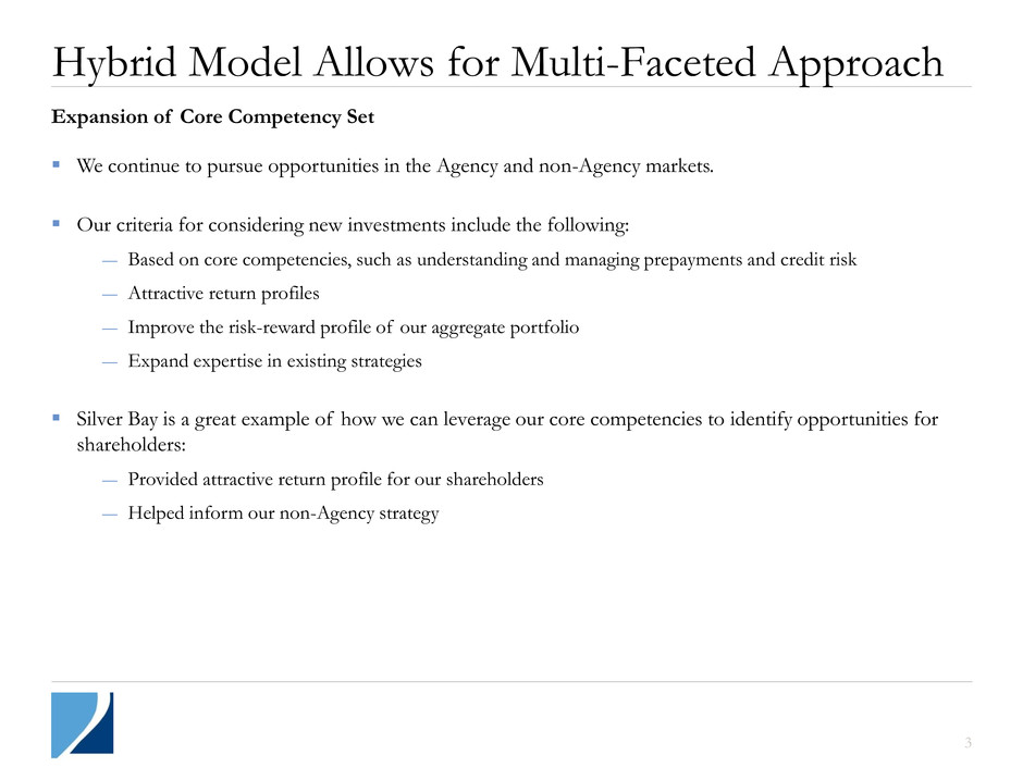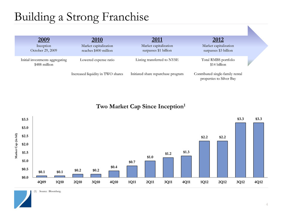 2 2012 and Fourth Quarter Results In 2012 we generated a return on book value of 47%1 with dividends of $1.71 per share, which was driven by an exceptional economic return of $1.05 billion. We delivered a total annual shareholder return of 40%2, which compares to a return of 19% for the sector3. In 2012 we made key hires on our investment and administrative teams. We contributed our portfolio of single-family residential homes to Silver Bay Realty Trust Corp. (“Silver Bay”) in conjunction with its initial public offering in December 2012. In exchange, Two Harbors received approximately 17.8 million shares of Silver Bay common stock. Our Book Value increased to $11.544 per diluted common share at December 31, 2012, representing a total quarterly return of 6% when combined with our fourth quarter dividend of $0.55. Executive Summary (1) See Appendix, page 17 for calculation of 2012 return on book value. (2) Source: Bloomberg. (3) As measured by the Pine River Mortgage REIT Index Total Return. (4) Diluted shares outstanding at end of period, which includes the effect of dilutive outstanding warrants determined using the treasury stock method, are used as the denominator for book value per share calculation.