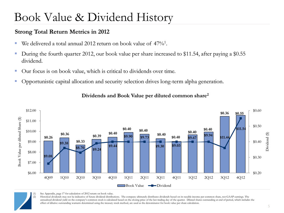 Building a Strong Franchise 4 (1) Source: Bloomberg. 2009 Inception October 29, 2009 Initial investments aggregating $488 million 2012 Market capitalization surpasses $3 billion Total RMBS portfolio $14 billion Contributed single-family rental properties to Silver Bay 2010 Market capitalization reaches $400 million Lowered expense ratio Increased liquidity in TWO shares 2011 Market capitalization surpasses $1 billion Listing transferred to NYSE Initiated share repurchase program $0.1 $0.1 $0.2 $0.2 $0.4 $0.7 $1.0 $1.2 $1.3 $2.2 $2.2 $3.3 $3.3 $0.0 $0.5 $1.0 $1.5 $2.0 $2.5 $3.0 $3.5 4Q09 1Q10 2Q10 3Q10 4Q10 1Q11 2Q11 3Q11 4Q11 1Q12 2Q12 3Q12 4Q12 M ar k e t C ap (in bi l) Two Market Cap Since Inception1