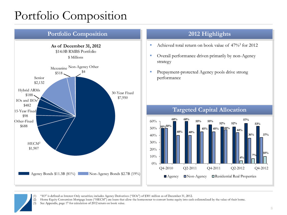 110 110 Portfolio Composition (1) “IO” is defined as Interest Only securities; includes Agency Derivatives (“IIOs”) of $301 million as of December 31, 2012. (2) Home Equity Conversion Mortgage loans (“HECM”) are loans that allow the homeowner to convert home equity into cash collateralized by the value of their home. (3) See Appendix, page 17 for calculation of 2012 return on book value. Targeted Capital Allocation 2012 Highlights As of December 31, 2012 $14.0B RMBS Portfolio $ Millions Agency Bonds $11.3B (81%) Non-Agency Bonds $2.7B (19%) 30-Year Fixed $7,950 15-Year Fixed $98 HECM2 $1,907 Other-Fixed $688 IOs and IIOs1 $482 Hybrid ARMs $188 Mezzanine $518 Senior $2,132 Non-Agency Other $4 Portfolio Composition 8 50% 60% 60% 55% 55% 52% 52% 57% 53% 50% 40% 40% 45% 45% 48% 44% 36% 37% 4% 7% 10% 0% 10% 20% 30% 40% 50% 60% Q4-2010 Q2-2011 Q4-2011 Q2-2012 Q4-2012 Agency Non-Agency Residential Real Properties Achieved total return on book value of 47%3 for 2012 Overall performance driven primarily by non-Agency strategy Prepayment-protected Agency pools drive strong performance