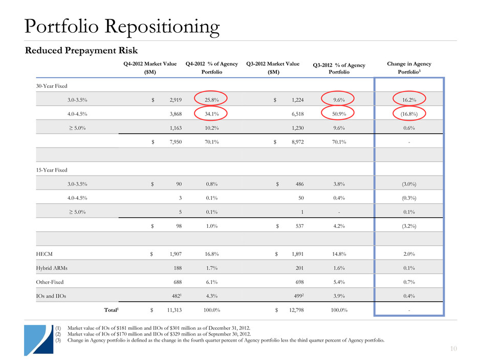 Agency Portfolio with Prepayment Protection Agency RMBS Portfolio Agency Strategy Agency Portfolio: $11.3B1 As of December 31, 2012 Other Low Loan Balance Pools4 15% Low FICO5 7% Post 2006 - Discount 2% Prepayment Protected 5% Seasoned6 6% HECM 17% High LTV (Predominately MHA)2 26% $85K Max Pools3 20% (1) Includes IIOs of $301 million as of December 31, 2012. (2) Securities collateralized by loans with greater than or equal to 80% loan-to-value ratio. High LTV pools are predominately Making Homeownership Affordable (“MHA”) pools. MHA pools consist of borrowers who have refinanced through HARP. (3) Securities collateralized by loans of less than or equal to $85K. (4) Securities collateralized by loans of less than or equal to $175K, but more than $85K. (5) Securities collateralized by loans held by lower credit borrowers as defined by Fair Isaac Corporation’s scoring model. (6) Securities collateralized by loans reflecting less prepayment risk due to previously experienced high levels of refinancing. (7) Represents the three month average constant prepayment rate (“CPR”) for Agency RMBS securities and Agency derivatives. Post 2006 - Premium & IOs 2% Reduced leverage on Agency securities to 5.7x Implicit or explicit prepayment protection of 98% Stable cash flows make interest rate hedging more effective Repositioned Agency portfolio reducing prepayment and pay- up risk Agency CPR7 Implicit or Explicit Prepayment Protected Securities (98%) Other (2%) 5.9% 5.6% 6.0% 6.0% 6.6% 0.0% 5.0% 10.0% 15.0% 20.0% Q4-2011 Q1-2012 Q2-2012 Q3-2012 Q4-2012 Agency RMBS CPR 9