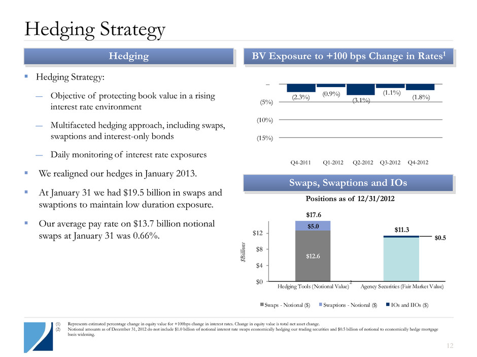 Non-Agency Portfolio with Sub-Prime Focus 11 Sub-Prime Exposure Non-Agency Strategy Non-Agency Portfolio Non-Agency Portfolio: $2.7B As of December 31, 2012 Option-ARM 8% Alt-A 4% Prime 1% Sub-Prime 87% Non-Agency underlying performance continues to improve; still potential upside Deeply discounted weighted average cost basis of $52.17 Improving underlying loan performance: Declining delinquencies, improving housing prices and servicers’ actions helping borrowers perform better Potential benefit from policy actions and housing recovery over time 26% 87% 0% 20% 40% 60% 80% 100% Q1-2010 Q3-2010 Q1-2011 Q3-2011 Q1-2012 Q3-2012 Prime Alt-A Option-ARM Sub-Prime