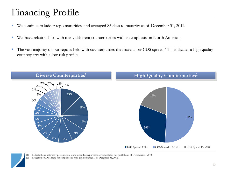 Hedging Strategy 12 Swaps, Swaptions and IOs BV Exposure to +100 bps Change in Rates1 $12.6 $5.0 $0.5 $0 $4 $8 $12 Hedging Tools (Notional Value) Agency Securities (Fair Market Value) Swaps - Notional ($) Swaptions - Notional ($) IOs and IIOs ($) 2 $B ill io ns Hedging Hedging Strategy: ― Objective of protecting book value in a rising interest rate environment ― Multifaceted hedging approach, including swaps, swaptions and interest-only bonds ― Daily monitoring of interest rate exposures We realigned our hedges in January 2013. At January 31 we had $19.5 billion in swaps and swaptions to maintain low duration exposure. Our average pay rate on $13.7 billion notional swaps at January 31 was 0.66%. (1) Represents estimated percentage change in equity value for +100bps change in interest rates. Change in equity value is total net asset change. (2) Notional amounts as of December 31, 2012 do not include $1.0 billion of notional interest rate swaps economically hedging our trading securities and $0.5 billion of notional to economically hedge mortgage basis widening. (2.3%) (0.9%) (3.1%) (1.1%) (1.8%) (15%) (10%) (5%) – Q3-2012 Q2-2012 Q1-2012 Q4-2011 Q4-2012 $17.6 $11.3 Positions as of 12/31/2012