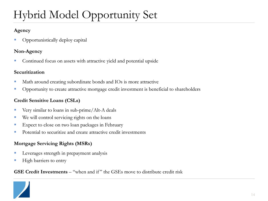 Hybrid Model Opportunity Set Agency Opportunistically deploy capital Non-Agency Continued focus on assets with attractive yield and potential upside Securitization Math around creating subordinate bonds and IOs is more attractive Opportunity to create attractive mortgage credit investment is beneficial to shareholders Credit Sensitive Loans (CSLs) Very similar to loans in sub-prime/Alt-A deals We will control servicing rights on the loans Expect to close on two loan packages in February Potential to securitize and create attractive credit investments Mortgage Servicing Rights (MSRs) Leverages strength in prepayment analysis High barriers to entry GSE Credit Investments – “when and if ” the GSEs move to distribute credit risk 14