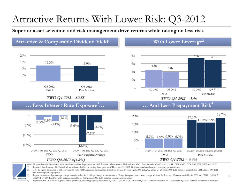 Attractive Returns With Lower Risk: Q3-2012 Attractive & Comparable Dividend Yield1… … With Lower Leverage2… … Less Interest Rate Exposure 3 … … And Less Prepayment Risk 4 4.3x 7.3x 3.8x 6.8x – 2x 4x 6x 8x 5.9% 17.5% 5.6% 15.9% 6.0% 15.9% 6.0% 18.7% – 5% 10% 15% 20% 12.3% 11.9% – 5% 10% 15% 20% Note: All peer financial data on this slide based on available September 30, 2012 financial information as filed with the SEC. Peers include AGNC, ANH, ARR, CIM, CMO, CYS, HTS, IVR, MFA and NLY. (1) Reported fourth quarter 2012 dividend annualized, divided by closing share price as of December 31, 2012. Dividend data based on peer company press releases. (2) Debt-to-equity defined as total borrowings to fund RMBS securities and Agency derivatives divided by total equity. Q3-2012, Q2-2012, Q1-2012 and Q4-2011 data not available for CIM; utilizes Q3-2011 data for comparative purposes. (3) Represents estimated percentage change in equity value for +100bps change in interest rates. Change in equity value is asset change adjusted for leverage. Data not available for CYS and CMO. Q3-2012, Q2-2012, Q1-2012 and Q4-2011 data not available for CIM; utilizes Q3-2011 data for comparative purposes. (4) Represents the CPR on the Agency RMBS portfolios, including Agency derivatives. Q3-2012, Q2-2012, Q1-2012 and Q4-2011 data not available for CIM; utilizes Q3-2011 data for comparative purposes. Q3-2012 TWO Q3-2012 Peer Median TWO Peer Median Superior asset selection and risk management drive returns while taking on less risk. Q4-2011 Q1-2012 Q2-2012 Q3-2012 Q4-2011 Q1-2012 Q2-2012 Q3-2012 Peer Median TWO Q2-2012 Q3-2012 Q2-2012 Q3-2012 (2.3%) (3.6%) (0.9%) (13.6%) (3.1%) (7.5%) (1. %) (3.7%) (15%) (10%) (5%) – TWO Peer Weighted Average Q4-2011 Q1-2012 Q2-2012 Q3-2012 Q4-2011 Q1-2012 Q2-2012 Q3-2012 15 TWO Q4-2012 = 3.4x TWO Q4-2012 =(1.8%) TWO Q4-2012 = 6.6% TWO Q4-2012 = $0.55