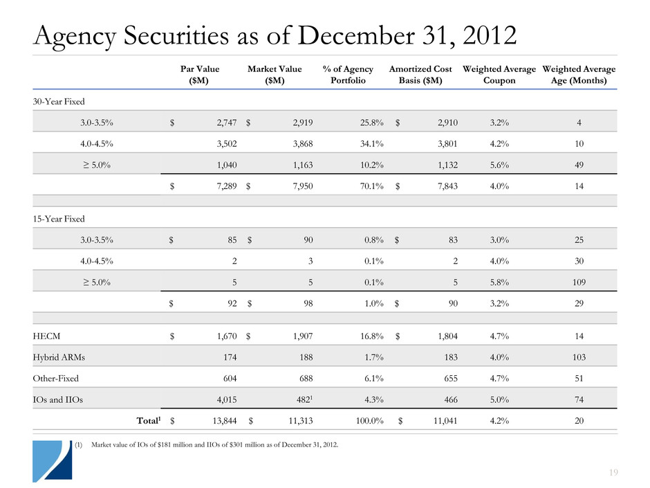 Agency: Vintage & Prepayment Protection Q3-2012 Q4-2012 High LTV (predominately MHA) 31% 26% $85K Max Pools 25% 20% HECM 15% 17% Other Low Loan Balance Pools 9% 15% Low FICO 6% 7% Seasoned (2005 and prior vintages) 6% 6% Prepayment protected 4% 5% 2006 & subsequent vintages - Discount 2% 2% 2006 & subsequent vintages – Premium and IOs 2% 2% Portfolio Composition as of December 31, 2012 Implicit or Explicit Pre-payment Protection Non-Agency: Loan Type Q3-2012 Q4-2012 Sub-Prime 86% 87% Option-ARM 9% 8% Alt-A 4% 4% Prime 1% 1% 18