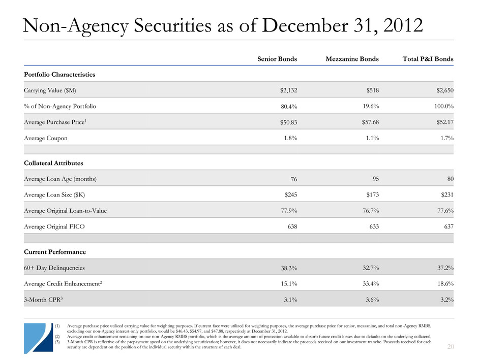 Agency Securities as of December 31, 2012 Par Value ($M) Market Value ($M) % of Agency Portfolio Amortized Cost Basis ($M) Weighted Average Coupon Weighted Average Age (Months) 30-Year Fixed 3.0-3.5% $ 2,747 $ 2,919 25.8% $ 2,910 3.2% 4 4.0-4.5% 3,502 3,868 34.1% 3,801 4.2% 10 ≥ 5.0% 1,040 1,163 10.2% 1,132 5.6% 49 $ 7,289 $ 7,950 70.1% $ 7,843 4.0% 14 15-Year Fixed 3.0-3.5% $ 85 $ 90 0.8% $ 83 3.0% 25 4.0-4.5% 2 3 0.1% 2 4.0% 30 ≥ 5.0% 5 5 0.1% 5 5.8% 109 $ 92 $ 98 1.0% $ 90 3.2% 29 HECM $ 1,670 $ 1,907 16.8% $ 1,804 4.7% 14 Hybrid ARMs 174 188 1.7% 183 4.0% 103 Other-Fixed 604 688 6.1% 655 4.7% 51 IOs and IIOs 4,015 4821 4.3% 466 5.0% 74 Total1 $ 13,844 $ 11,313 100.0% $ 11,041 4.2% 20 (1) Market value of IOs of $181 million and IIOs of $301 million as of December 31, 2012. 19