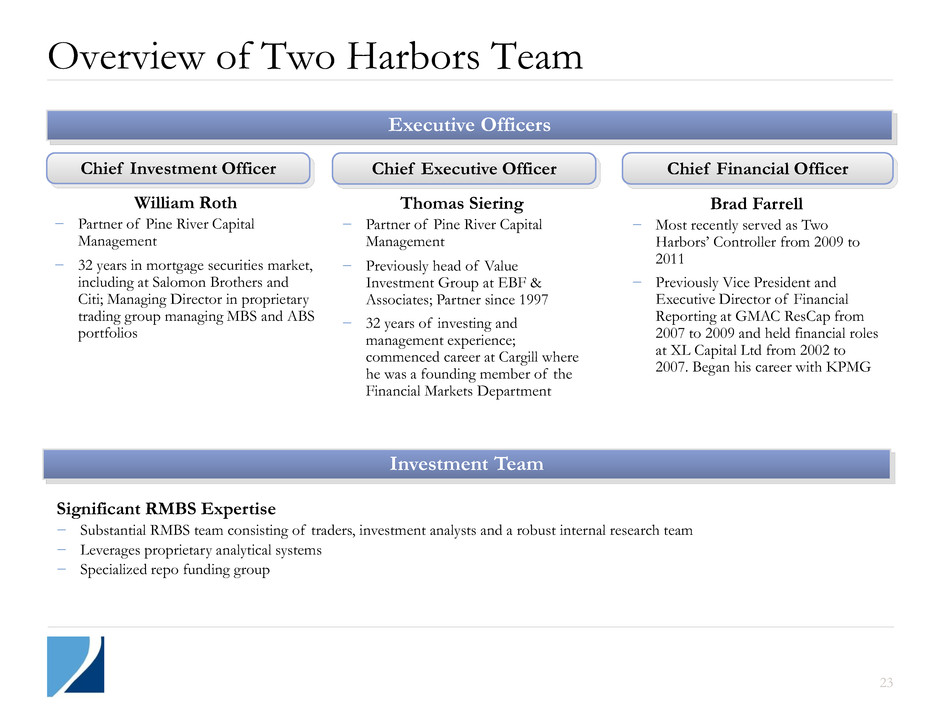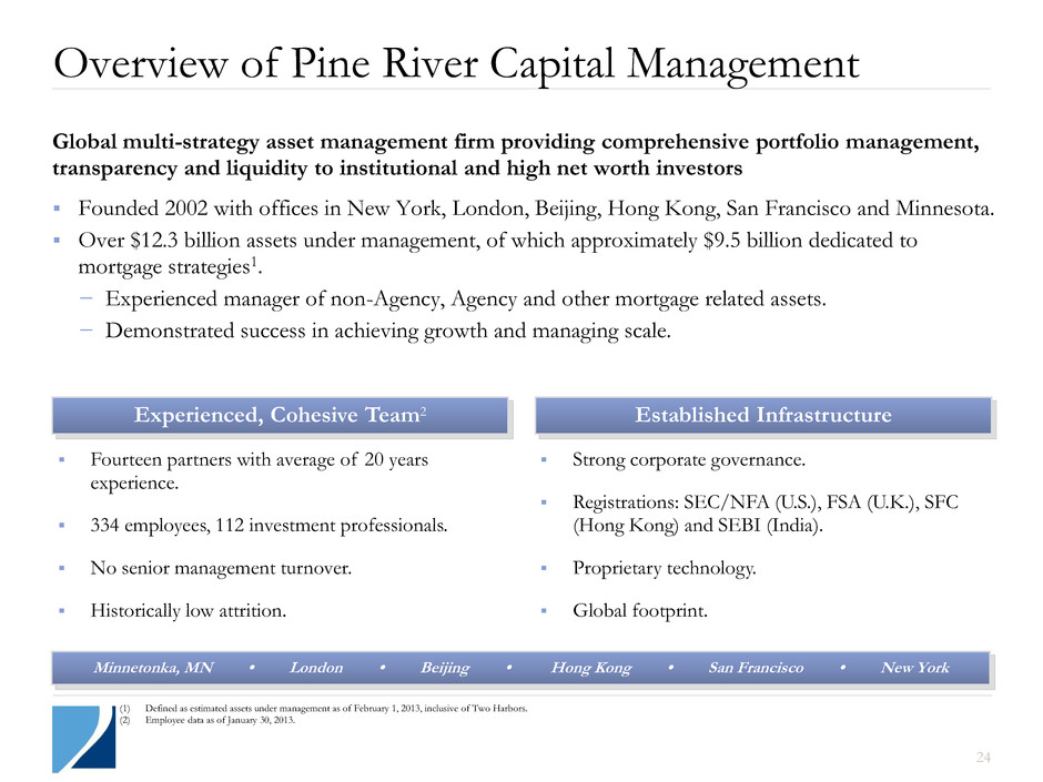 23 William Roth − Partner of Pine River Capital Management − 32 years in mortgage securities market, including at Salomon Brothers and Citi; Managing Director in proprietary trading group managing MBS and ABS portfolios Brad Farrell − Most recently served as Two Harbors’ Controller from 2009 to 2011 − Previously Vice President and Executive Director of Financial Reporting at GMAC ResCap from 2007 to 2009 and held financial roles at XL Capital Ltd from 2002 to 2007. Began his career with KPMG Thomas Siering − Partner of Pine River Capital Management − Previously head of Value Investment Group at EBF & Associates; Partner since 1997 − 32 years of investing and management experience; commenced career at Cargill where he was a founding member of the Financial Markets Department Significant RMBS Expertise − Substantial RMBS team consisting of traders, investment analysts and a robust internal research team − Leverages proprietary analytical systems − Specialized repo funding group Chief Financial Officer Chief Executive Officer Chief Investment Officer Overview of Two Harbors Team Executive Officers Investment Team