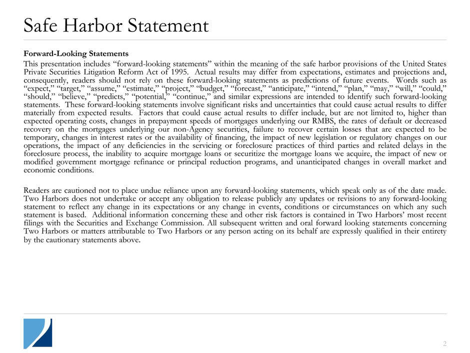 2 Forward-Looking Statements This presentation includes “forward-looking statements” within the meaning of the safe harbor provisions of the United States Private Securities Litigation Reform Act of 1995. Actual results may differ from expectations, estimates and projections and, consequently, readers should not rely on these forward-looking statements as predictions of future events. Words such as “expect,” “target,” “assume,” “estimate,” “project,” “budget,” “forecast,” “anticipate,” “intend,” “plan,” “may,” “will,” “could,” “should,” “believe,” “predicts,” “potential,” “continue,” and similar expressions are intended to identify such forward-looking statements. These forward-looking statements involve significant risks and uncertainties that could cause actual results to differ materially from expected results. Factors that could cause actual results to differ include, but are not limited to, higher than expected operating costs, changes in prepayment speeds of mortgages underlying our RMBS, the rates of default or decreased recovery on the mortgages underlying our non-Agency securities, failure to recover certain losses that are expected to be temporary, changes in interest rates or the availability of financing, the impact of new legislation or regulatory changes on our operations, the impact of any deficiencies in the servicing or foreclosure practices of third parties and related delays in the foreclosure process, the inability to acquire mortgage loans or securitize the mortgage loans we acquire, the impact of new or modified government mortgage refinance or principal reduction programs, and unanticipated changes in overall market and economic conditions. Readers are cautioned not to place undue reliance upon any forward-looking statements, which speak only as of the date made. Two Harbors does not undertake or accept any obligation to release publicly any updates or revisions to any forward-looking statement to reflect any change in its expectations or any change in events, conditions or circumstances on which any such statement is based. Additional information concerning these and other risk factors is contained in Two Harbors’ most recent filings with the Securities and Exchange Commission. All subsequent written and oral forward looking statements concerning Two Harbors or matters attributable to Two Harbors or any person acting on its behalf are expressly qualified in their entirety by the cautionary statements above. Safe Harbor Statement