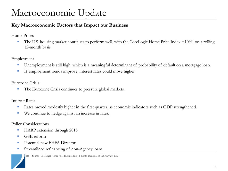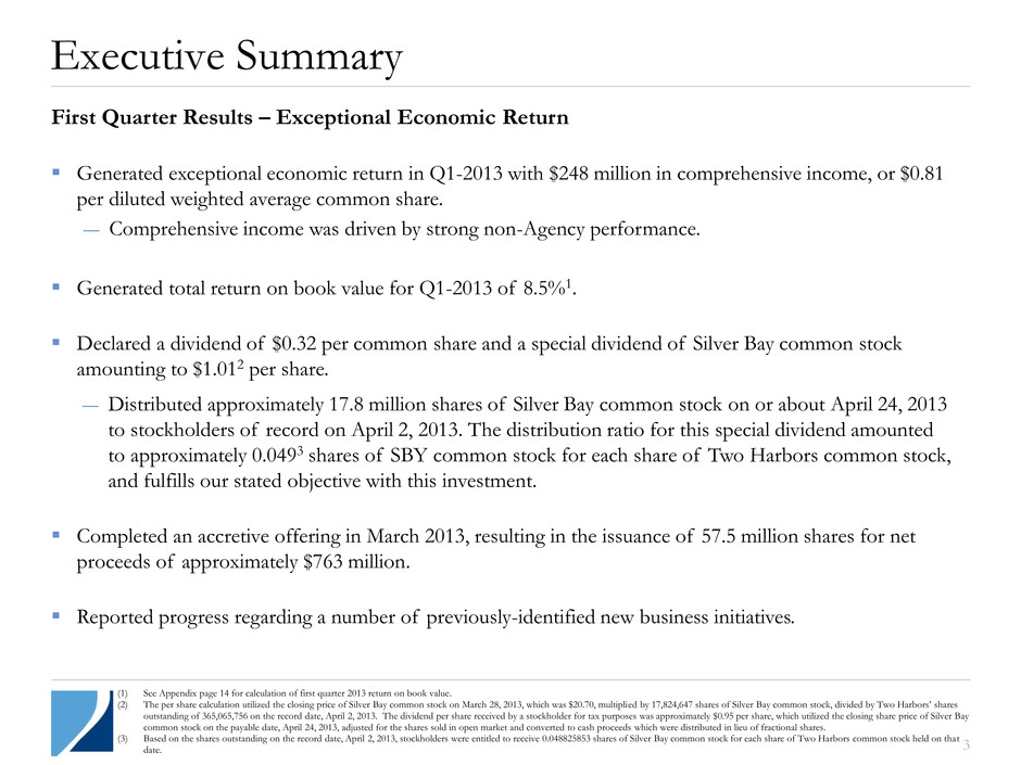 Executive Summary First Quarter Results – Exceptional Economic Return Generated exceptional economic return in Q1-2013 with $248 million in comprehensive income, or $0.81 per diluted weighted average common share. ― Comprehensive income was driven by strong non-Agency performance. Generated total return on book value for Q1-2013 of 8.5%1. Declared a dividend of $0.32 per common share and a special dividend of Silver Bay common stock amounting to $1.012 per share. ― Distributed approximately 17.8 million shares of Silver Bay common stock on or about April 24, 2013 to stockholders of record on April 2, 2013. The distribution ratio for this special dividend amounted to approximately 0.0493 shares of SBY common stock for each share of Two Harbors common stock, and fulfills our stated objective with this investment. Completed an accretive offering in March 2013, resulting in the issuance of 57.5 million shares for net proceeds of approximately $763 million. Reported progress regarding a number of previously-identified new business initiatives. (1) See Appendix page 14 for calculation of first quarter 2013 return on book value. (2) The per share calculation utilized the closing price of Silver Bay common stock on March 28, 2013, which was $20.70, multiplied by 17,824,647 shares of Silver Bay common stock, divided by Two Harbors’ shares outstanding of 365,065,756 on the record date, April 2, 2013. The dividend per share received by a stockholder for tax purposes was approximately $0.95 per share, which utilized the closing share price of Silver Bay common stock on the payable date, April 24, 2013, adjusted for the shares sold in open market and converted to cash proceeds which were distributed in lieu of fractional shares. (3) Based on the shares outstanding on the record date, April 2, 2013, stockholders were entitled to receive 0.048825853 shares of Silver Bay common stock for each share of Two Harbors common stock held on that date. 3