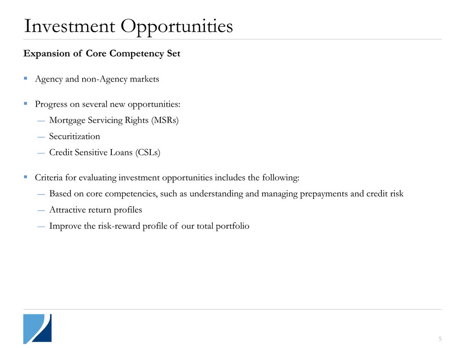 5 Investment Opportunities Expansion of Core Competency Set Agency and non-Agency markets Progress on several new opportunities: ― Mortgage Servicing Rights (MSRs) ― Securitization ― Credit Sensitive Loans (CSLs) Criteria for evaluating investment opportunities includes the following: ― Based on core competencies, such as understanding and managing prepayments and credit risk ― Attractive return profiles ― Improve the risk-reward profile of our total portfolio