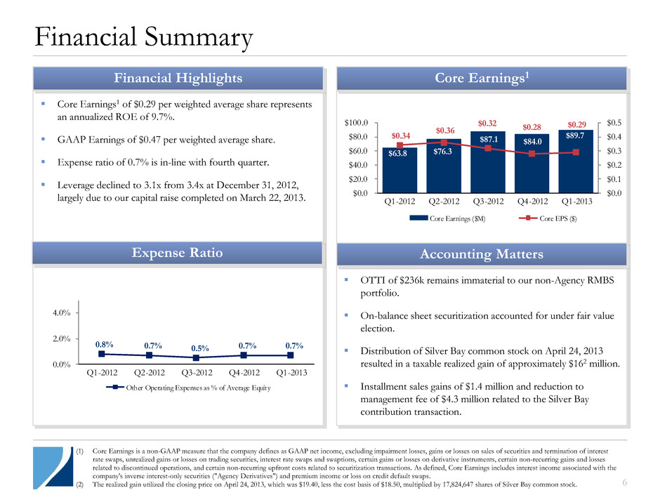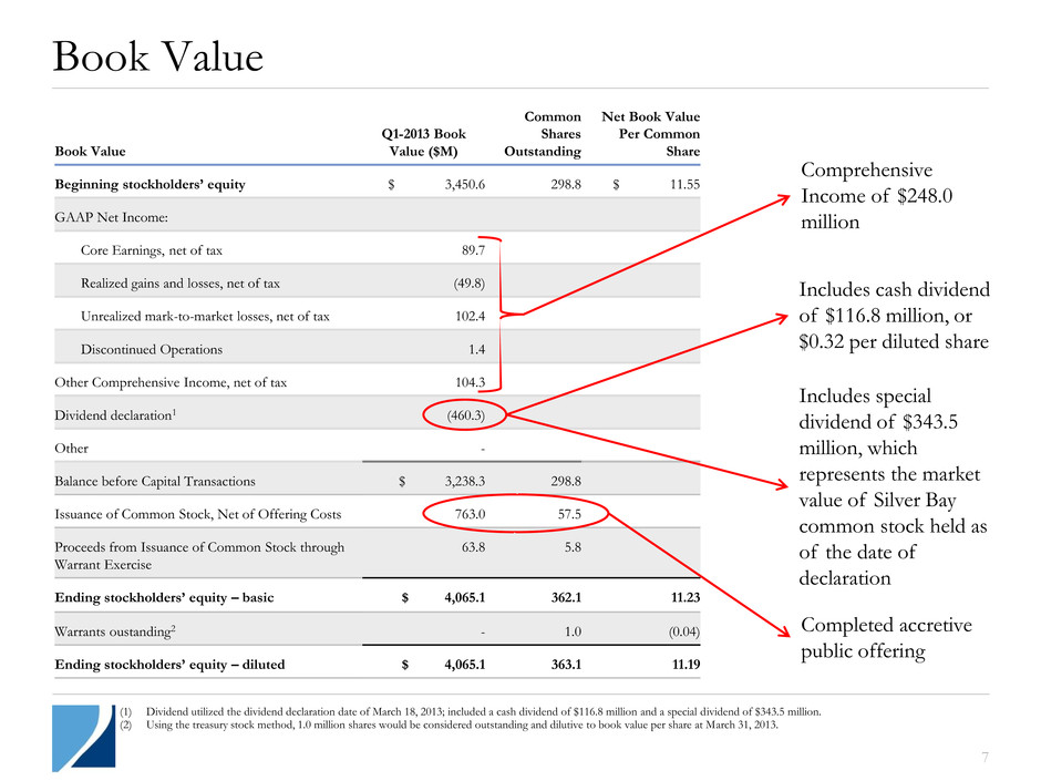 110 110 Financial Summary Financial Highlights Core Earnings1 Expense Ratio Core Earnings1 of $0.29 per weighted average share represents an annualized ROE of 9.7%. GAAP Earnings of $0.47 per weighted average share. Expense ratio of 0.7% is in-line with fourth quarter. Leverage declined to 3.1x from 3.4x at December 31, 2012, largely due to our capital raise completed on March 22, 2013. $63.8 $76.3 $87.1 $84.0 $89.7$0.34 $0.36 $0.32 $0.28 $0.29 $0.0 $0.1 $0.2 $0.3 $0.4 $0.5 $0.0 $20.0 $40.0 $60.0 $80.0 $100.0 Q1-2012 Q2-2012 Q3-2012 Q4-2012 Q1-2013 Core Earnings ($M) Core EPS ($) 0.8% 0.7% 0.5% 0.7% 0.7% 0.0% 2.0% 4.0% Q1-2012 Q2-2012 Q3-2012 Q4-2012 Q1-2013 Other Operating Expenses as % of Average Equity (1) Core Earnings is a non-GAAP measure that the company defines as GAAP net income, excluding impairment losses, gains or losses on sales of securities and termination of interest rate swaps, unrealized gains or losses on trading securities, interest rate swaps and swaptions, certain gains or losses on derivative instruments, certain non-recurring gains and losses related to discontinued operations, and certain non-recurring upfront costs related to securitization transactions. As defined, Core Earnings includes interest income associated with the company's inverse interest-only securities ("Agency Derivatives") and premium income or loss on credit default swaps. (2) The realized gain utilized the closing price on April 24, 2013, which was $19.40, less the cost basis of $18.50, multiplied by 17,824,647 shares of Silver Bay common stock. Accounting Matters OTTI of $236k remains immaterial to our non-Agency RMBS portfolio. On-balance sheet securitization accounted for under fair value election. Distribution of Silver Bay common stock on April 24, 2013 resulted in a taxable realized gain of approximately $162 million. Installment sales gains of $1.4 million and reduction to management fee of $4.3 million related to the Silver Bay contribution transaction. 6