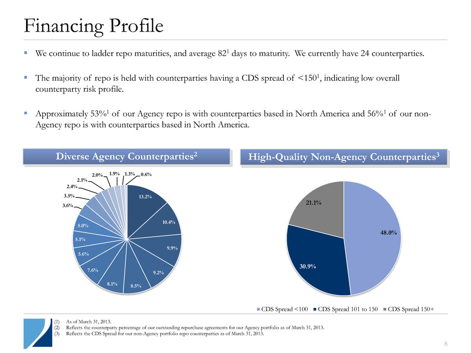 7 Book Value Book Value Q1-2013 Book Value ($M) Common Shares Outstanding Net Book Value Per Common Share Beginning stockholders’ equity $ 3,450.6 298.8 $ 11.55 GAAP Net Income: Core Earnings, net of tax 89.7 Realized gains and losses, net of tax (49.8) Unrealized mark-to-market losses, net of tax 102.4 Discontinued Operations 1.4 Other Comprehensive Income, net of tax 104.3 Dividend declaration1 (460.3) Other - Balance before Capital Transactions $ 3,238.3 298.8 Issuance of Common Stock, Net of Offering Costs 763.0 57.5 Proceeds from Issuance of Common Stock through Warrant Exercise 63.8 5.8 Ending stockholders’ equity – basic $ 4,065.1 362.1 11.23 Warrants oustanding2 - 1.0 (0.04) Ending stockholders’ equity – diluted $ 4,065.1 363.1 11.19 (1) Dividend utilized the dividend declaration date of March 18, 2013; included a cash dividend of $116.8 million and a special dividend of $343.5 million. (2) Using the treasury stock method, 1.0 million shares would be considered outstanding and dilutive to book value per share at March 31, 2013. Includes cash dividend of $116.8 million, or $0.32 per diluted share Includes special dividend of $343.5 million, which represents the market value of Silver Bay common stock held as of the date of declaration Completed accretive public offering Comprehensive Income of $248.0 million