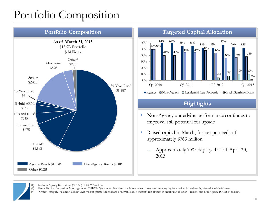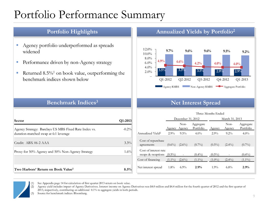 110 Agency portfolio underperformed as spreads widened Performance driven by non-Agency strategy Returned 8.5%1 on book value, outperforming the benchmark indices shown below Sector Q1-2013 Agency Strategy: Barclays US MBS Fixed Rate Index vs. duration-matched swap at 6:1 leverage -0.2% Credit: ABX 06-2 AAA 3.3% Proxy for 50% Agency and 50% Non-Agency Strategy 1.6% Two Harbors’ Return on Book Value1 8.5% Benchmark Indices3 Portfolio Performance Summary 9 110 3.5% 3.3% 3.1% 2.9% 2.9% 9.7% 9.6% 9.6% 9.5% 9.2% 4.9% 4.6% 4.2% 4.0% 4.0% – 2.0% 4.0% 6.0% 8.0% 10.0% 12.0% Q1-2012 Q2-2012 Q3-2012 Q4-2012 Q1-2013 Agency RMBS Non-Agency RMBS Aggregate Portfolio (1) See Appendix page 14 for calculation of first quarter 2013 return on book value. (2) Agency yield includes impact of Agency Derivatives. Interest income on Agency Derivatives was $4.0 million and $4.4 million for the fourth quarter of 2012 and the first quarter of 2013, respectively, contributing an additional 0.1% to aggregate yields in both periods. (3) Source for benchmark indices: Bloomberg. Three Months Ended December 31, 2012 March 31, 2013 Agency Non- Agency Aggregate Portfolio Agency Non- Agency Aggregate Portfolio Annualized Yield2 2.9% 9.5% 4.0% 2.9% 9.2% 4.0% Cost of repurchase agreements (0.6%) (2.6%) (0.7%) (0.5%) (2.4%) (0.7%) Cost of interest rate swaps & swaptions (0.5%) - (0.4%) (0.5%) - (0.4%) Cost of financing (1.1%) (2.6%) (1.1%) (1.0%) (2.4%) (1.1%) Net interest spread 1.8% 6.9% 2.9% 1.9% 6.8% 2.9% Portfolio Highlights Annualized Yields by Portfolio2 Net Interest Spread