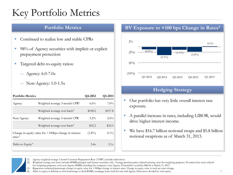 110 110 Portfolio Composition 10 (1) Includes Agency Derivatives (“IIOs”) of $309.7 million. (2) Home Equity Conversion Mortgage loans (“HECM”) are loans that allow the homeowner to convert home equity into cash collateralized by the value of their home. (3) “Other” category includes CSLs of $123 million, prime jumbo loans of $69 million, net economic interest in securitization of $37 million, and non-Agency IOs of $4 million. Highlights Targeted Capital Allocation Non-Agency underlying performance continues to improve, still potential for upside Raised capital in March, for net proceeds of approximately $763 million ― Approximately 75% deployed as of April 30, 2013 As of March 31, 2013 $15.5B Portfolio $ Millions Agency Bonds $12.3B Non-Agency Bonds $3.0B 30-Year Fixed $8,887 15-Year Fixed $91 HECM2 $1,892 Other-Fixed $675 IOs and IIOs1 $515 Hybrid ARMs $182 Mezzanine $576 Senior $2,451 Portfolio Composition 50% 60% 60% 55% 55% 52% 52% 57% 53% 52% 50% 40% 40% 45% 45% 48% 44% 36% 37% 38% 4% 7% 10% 10% 1% 0% 10% 20% 30% 40% 50% 60% Q4-2010 Q3-2011 Q2-2012 Q1-2013 Agency Non-Agency Residential Real Properties Credit Sensitive Loans Other $0.2B Other3 $233