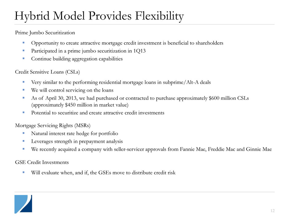 110 (0.9%) (3.1%) (1.1%) (1.8%) 0.1% (10%) (6%) (2%) 11 110 Key Portfolio Metrics Continued to realize low and stable CPRs 98% of Agency securities with implicit or explicit prepayment protection Targeted debt-to-equity ratios: ― Agency: 6.0-7.0x ― Non-Agency: 1.0-1.5x (1) Agency weighted average 3-month Constant Prepayment Rate (“CPR”) includes derivatives. (2) Weighted average cost basis includes RMBS principal and interest securities only. Average purchase price utilized carrying value for weighting purposes. If current face were utilized for weighting purposes, total non-Agency RMBS excluding the company’s non-Agency IO portfolio would be $48.56 at March 31, 2013. (3) Represents estimated percentage change in equity value for +100bps change in interest rates. Change in equity value is total net asset change. (4) Debt-to-equity is defined as total borrowings to fund RMBS, mortgage loans held-for-sale and Agency Derivatives divided by total equity. Our portfolio has very little overall interest rate exposure. A parallel increase in rates, including LIBOR, would drive higher interest income. We have $16.7 billion notional swaps and $5.8 billion notional swaptions as of March 31, 2013. Portfolio Metrics Q4-2012 Q1-2013 Agency Weighted average 3-month CPR1 6.6% 7.0% Weighted average cost basis2 $108.2 $107.8 Non-Agency Weighted average 3-month CPR 3.2% 2.6% Weighted average cost basis2 $52.2 $52.3 Change in equity value for +100bps change in interest rates3 (1.8%) 0.1% Debt-to-Equity4 3.4x 3.1x Portfolio Metrics BV Exposure to +100 bps Change in Rates3 Q4-2012 Hedging Strategy Q3-2012 Q2-2012 Q1-2012 Q1-2013 2%