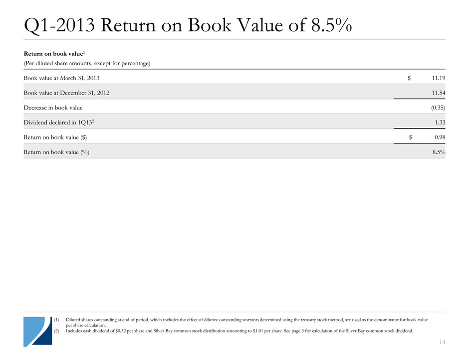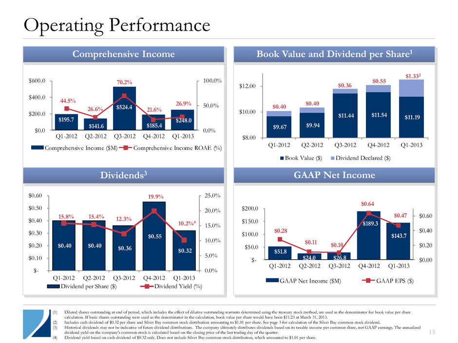 14 Q1-2013 Return on Book Value of 8.5% Return on book value1 (Per diluted share amounts, except for percentage) Book value at March 31, 2013 $ 11.19 Book value at December 31, 2012 11.54 Decrease in book value (0.35) Dividend declared in 1Q132 1.33 Return on book value ($) $ 0.98 Return on book value (%) 8.5% (1) Diluted shares outstanding at end of period, which includes the effect of dilutive outstanding warrants determined using the treasury stock method, are used as the denominator for book value per share calculation. (2) Includes cash dividend of $0.32 per share and Silver Bay common stock distribution amounting to $1.01 per share. See page 3 for calculation of the Silver Bay common stock dividend.