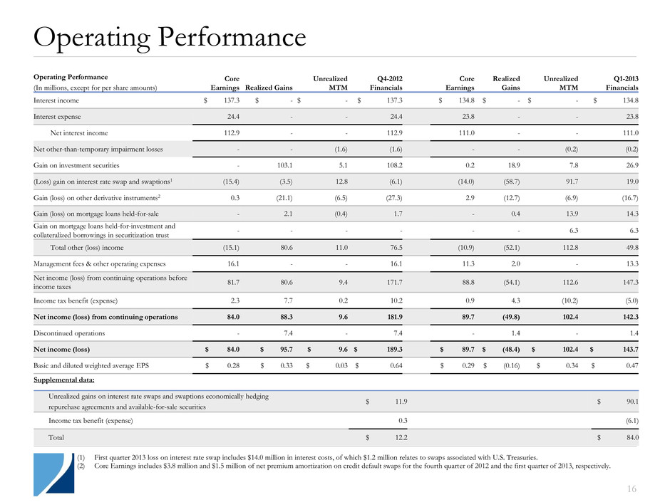 15 110 Operating Performance 110 110 $195.7 $141.6 $524.4 $185.4 $248.0 44.5% 26.6% 70.2% 21.6% 26.9% 0.0% 50.0% 100.0% $0.0 $200.0 $400.0 $600.0 Q1-2012 Q2-2012 Q3-2012 Q4-2012 Q1-2013 Comprehensive Income ($M) Comprehensive Income ROAE (%) (1) Diluted shares outstanding at end of period, which includes the effect of dilutive outstanding warrants determined using the treasury stock method, are used as the denominator for book value per share calculation. If basic shares outstanding were used as the denominator in the calculation, book value per share would have been $11.23 at March 31, 2013. (2) Includes cash dividend of $0.32 per share and Silver Bay common stock distribution amounting to $1.01 per share. See page 3 for calculation of the Silver Bay common stock dividend. (3) Historical dividends may not be indicative of future dividend distributions. The company ultimately distributes dividends based on its taxable income per common share, not GAAP earnings. The annualized dividend yield on the company’s common stock is calculated based on the closing price of the last trading day of the quarter. (4) Dividend yield based on cash dividend of $0.32 only. Does not include Silver Bay common stock distribution, which amounted to $1.01 per share. Book Value and Dividend per Share1 GAAP Net Income Comprehensive Income Dividends3 $51.8 $24.0 $26.8 $189.3 $143.7 $0.28 $0.11 $0.10 $0.64 $0.47 $0.00 $0.20 $0.40 $0.60 $- $50.0 $100.0 $150.0 $200.0 Q1-2012 Q2-2012 Q3-2012 Q4-2012 Q1-2013 GAAP Net Income ($M) GAAP EPS ($) $0.40 $0.40 $0.36 $0.55 $0.32 15.8% 15.4% 12.3% 19.9% 10.2%4 0.0% 5.0% 10.0% 15.0% 20.0% 25.0% $- $0.10 $0.20 $0.30 $0.40 $0.50 $0.60 Q1-2012 Q2-2012 Q3-2012 Q4-2012 Q1-2013 Dividend per Share ($) Dividend Yield (%) $9.67 $9.94 $11.44 $11.54 $11.19 $0.40 $0.40 $0.36 $0.55 $1.332 $8.00 $10.00 $12.00 Q1-2012 Q2-2012 Q3-2012 Q4-2012 Q1-2013 Book Value ($) Dividend Declared ($)