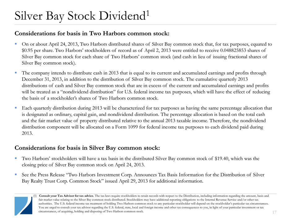 17 Silver Bay Stock Dividend1 Considerations for basis in Two Harbors common stock: On or about April 24, 2013, Two Harbors distributed shares of Silver Bay common stock that, for tax purposes, equated to $0.95 per share. Two Harbors’ stockholders of record as of April 2, 2013 were entitled to receive 0.048825853 shares of Silver Bay common stock for each share of Two Harbors’ common stock (and cash in lieu of issuing fractional shares of Silver Bay common stock). The company intends to distribute cash in 2013 that is equal to its current and accumulated earnings and profits through December 31, 2013, in addition to the distribution of Silver Bay common stock. The cumulative quarterly 2013 distributions of cash and Silver Bay common stock that are in excess of the current and accumulated earnings and profits will be treated as a “nondividend distribution” for U.S. federal income tax purposes, which will have the effect of reducing the basis of a stockholder’s shares of Two Harbors common stock. Each quarterly distribution during 2013 will be characterized for tax purposes as having the same percentage allocation that is designated as ordinary, capital gain, and nondividend distribution. The percentage allocation is based on the total cash and the fair market value of property distributed relative to the annual 2013 taxable income. Therefore, the nondividend distribution component will be allocated on a Form 1099 for federal income tax purposes to each dividend paid during 2013. Considerations for basis in Silver Bay common stock: Two Harbors’ stockholders will have a tax basis in the distributed Silver Bay common stock of $19.40, which was the closing price of Silver Bay common stock on April 24, 2013. See the Press Release “Two Harbors Investment Corp. Announces Tax Basis Information for the Distribution of Silver Bay Realty Trust Corp. Common Stock” issued April 29, 2013 for additional information. (1) Consult your Tax Advisor for tax advice. The tax laws require stockholders to retain records with respect to the Distribution, including information regarding the amount, basis and fair market value relating to the Silver Bay common stock distributed. Stockholders may have additional reporting obligations to the Internal Revenue Service and/or other tax authorities. The U.S. federal income tax treatment of holding Two Harbors common stock to any particular stockholder will depend on the stockholder’s particular tax circumstances. You are urged to consult your tax advisor regarding the U.S. federal, state, local and foreign income and other tax consequences to you, in light of your particular investment or tax circumstances, of acquiring, holding and disposing of Two Harbors common stock.