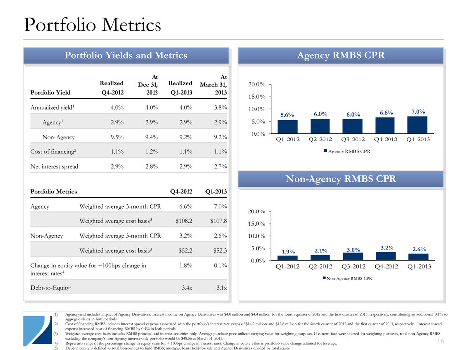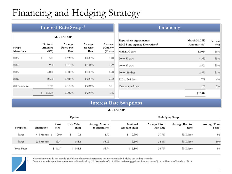 18 Portfolio Metrics 110 Portfolio Yield Realized Q4-2012 At Dec 31, 2012 Realized Q1-2013 At March 31, 2013 Annualized yield1 4.0% 4.0% 4.0% 3.8% Agency1 2.9% 2.9% 2.9% 2.9% Non-Agency 9.5% 9.4% 9.2% 9.2% Cost of financing2 1.1% 1.2% 1.1% 1.1% Net interest spread 2.9% 2.8% 2.9% 2.7% Portfolio Metrics Q4-2012 Q1-2013 Agency Weighted average 3-month CPR 6.6% 7.0% Weighted average cost basis3 $108.2 $107.8 Non-Agency Weighted average 3-month CPR 3.2% 2.6% Weighted average cost basis3 $52.2 $52.3 Change in equity value for +100bps change in interest rates4 1.8% 0.1% Debt-to-Equity5 3.4x 3.1x Portfolio Yields and Metrics 110 Agency RMBS CPR Non-Agency RMBS CPR 1.9% 2.1% 3.0% 3.2% 2.6% 0.0% 5.0% 10.0% 15.0% 20.0% Q1-2012 Q2-2012 Q3-2012 Q4-2012 Q1-2013 Non-Agency RMBS CPR 5.6% 6.0% 6.0% 6.6% 7.0% 0.0% 5.0% 10.0% 15.0% 20.0% Q1-2012 Q2-2012 Q3-2012 Q4-2012 Q1-2013 Agency RMBS CPR (1) Agency yield includes impact of Agency Derivatives. Interest income on Agency Derivatives was $4.0 million and $4.4 million for the fourth quarter of 2012 and the first quarter of 2013, respectively, contributing an additional 0.1% to aggregate yields in both periods. (2) Cost of financing RMBS includes interest spread expense associated with the portfolio’s interest rate swaps of $14.2 million and $12.8 million for the fourth quarter of 2012 and the first quarter of 2013, respectively. Interest spread expense increased cost of financing RMBS by 0.4% in both periods. (3) Weighted average cost basis includes RMBS principal and interest securities only. Average purchase price utilized carrying value for weighting purposes. If current face were utilized for weighting purposes, total non-Agency RMBS excluding the company’s non-Agency interest-only portfolio would be $48.56 at March 31, 2013. (4) Represents range of the percentage change in equity value for + 100bps change in interest rates. Change in equity value is portfolio value change adjusted for leverage. (5) Debt-to-equity is defined as total borrowings to fund RMBS, mortgage loans held-for-sale and Agency Derivatives divided by total equity.