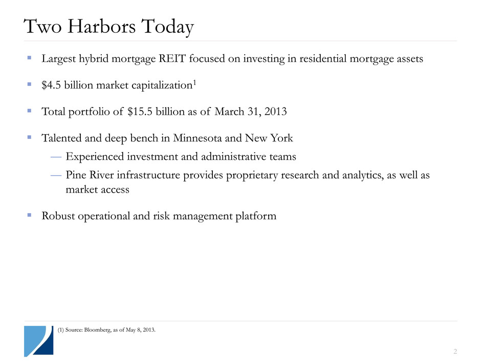 Safe Harbor Statement Forward-Looking Statements This presentation includes “forward-looking statements” within the meaning of the safe harbor provisions of the United States Private Securities Litigation Reform Act of 1995. Actual results may differ from expectations, estimates and projections and, consequently, readers should not rely on these forward-looking statements as predictions of future events. Words such as “expect,” “target,” “assume,” “estimate,” “project,” “budget,” “forecast,” “anticipate,” “intend,” “plan,” “may,” “will,” “could,” “should,” “believe,” “predicts,” “potential,” “continue,” and similar expressions are intended to identify such forward-looking statements. These forward-looking statements involve significant risks and uncertainties that could cause actual results to differ materially from expected results. Factors that could cause actual results to differ include, but are not limited to, higher than expected operating costs, changes in prepayment speeds of mortgages underlying our RMBS, the rates of default or decreased recovery on the mortgages underlying our non-Agency securities, failure to recover certain losses that are expected to be temporary, changes in interest rates or the availability of financing, the impact of new legislation or regulatory changes on our operations, the impact of any deficiencies in the servicing or foreclosure practices of third parties and related delays in the foreclosure process, the inability to acquire mortgage loans or securitize the mortgage loans we acquire, the impact of new or modified government mortgage refinance or principal reduction programs, and unanticipated changes in overall market and economic conditions. Readers are cautioned not to place undue reliance upon any forward-looking statements, which speak only as of the date made. Two Harbors does not undertake or accept any obligation to release publicly any updates or revisions to any forward-looking statement to reflect any change in its expectations or any change in events, conditions or circumstances on which any such statement is based. Additional information concerning these and other risk factors is contained in Two Harbors’ most recent filings with the Securities and Exchange Commission. All subsequent written and oral forward looking statements concerning Two Harbors or matters attributable to Two Harbors or any person acting on its behalf are expressly qualified in their entirety by the cautionary statements above. 1