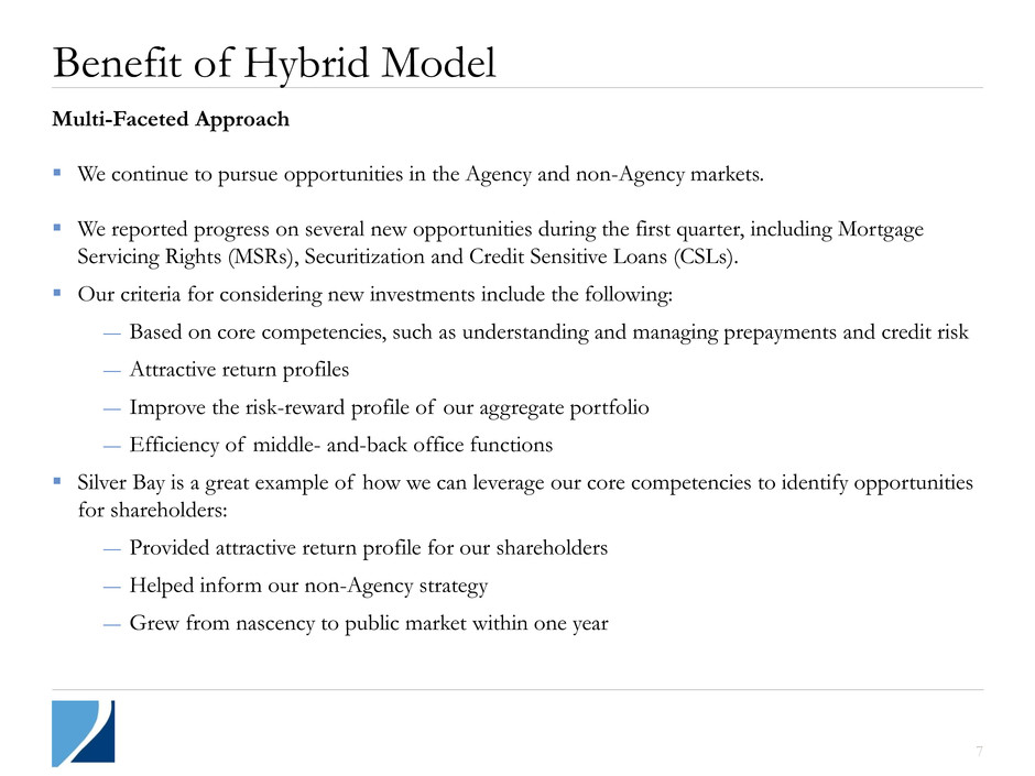 Book Value & Dividend History 6 (1) Historical dividends may not be indicative of future dividend distributions. The company ultimately distributes dividends based on its taxable income per common share, not GAAP earnings. The annualized dividend yield on the company’s common stock is calculated based on the closing price of the last trading day of the quarter. Diluted shares outstanding at end of period, which includes the effect of dilutive outstanding warrants determined using the treasury stock method, are used as the denominator for book value per share calculation. (2) See Appendix, page 17 for calculation of Q1-2013 return on book value. (3) The per share calculation utilized the closing price of Silver Bay common stock on March 28, 2013, which was $20.70, multiplied by 17,824,647 shares of Silver Bay common stock, divided by Two Harbors’ shares outstanding of 365,065,756 on the record date, April 2, 2013. The dividend per share received by a stockholder for tax purposes was approximately $0.95 per share, which utilized the closing share price of Silver Bay common stock on the payable date, April 24, 2013, adjusted for the shares sold in open market and converted to cash proceeds which were distributed in lieu of fractional shares. Our focus is on book value, which is critical to dividend generation over time. Opportunistic capital allocation and security selection drives long-term alpha generation. Dividends and Book Value per diluted common share1 Strong Return on Book Value $9.08 $9.38 $8.70 $9.24 $9.44 $9.90 $9.73 $9.30 $9.03 $9.67 $9.94 $11.44 $11.54 $11.19 $0.26 $0.36 $0.33 $0.39 $0.40 $0.40 $0.40 $0.40 $0.40 $0.40 $0.40 $0.36 $0.55 $1.013 $- $2.00 $4.00 $6.00 $8.00 $10.00 $12.00 $14.00 4Q09 1Q10 2Q10 3Q10 4Q10 1Q11 2Q11 3Q11 4Q11 1Q12 2Q12 3Q12 4Q12 1Q13 B o o k Val u e p er d il u te d Sha re ( $) Book Value Dividend 8.5%2 return on book value after accounting for first quarter dividend