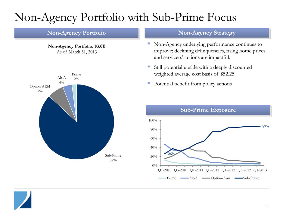 Agency Portfolio with Prepayment Protection Agency RMBS Portfolio Agency Strategy Agency Portfolio: $12.3B1 As of March 31, 2013 Other Low Loan Balance Pools4 15% Low FICO5 7% Post 2006 - Discount 2% Prepayment Protected 5% Seasoned6 5% HECM 15% High LTV (Predominately MHA)2 27% $85K Max Pools3 22% (1) Includes IIOs of $309.7 million as of March 31, 2013. (2) Securities collateralized by loans with greater than or equal to 80% loan-to-value ratio. High LTV pools are predominately Making Homeownership Affordable (“MHA”) pools. MHA pools consist of borrowers who have refinanced through HARP. (3) Securities collateralized by loans of less than or equal to $85K. (4) Securities collateralized by loans of less than or equal to $175K, but more than $85K. (5) Securities collateralized by loans held by lower credit borrowers as defined by Fair Isaac Corporation’s scoring model. (6) Securities collateralized by loans reflecting less prepayment risk due to previously experienced high levels of refinancing. (7) Represents the three month average constant prepayment rate (“CPR”) for Agency RMBS securities and Agency derivatives. Post 2006 - Premium & IOs 2% Implicit or explicit prepayment protection of 98% Stable cash flows make interest rate hedging more effective Agency RMBS CPR7 Implicit or Explicit Prepayment Protected Securities (98%) Other (2%) 10 5.6% 6.0% 6.0% 6.6% 7.0% 0.0% 5.0% 10.0% 15.0% 20.0% Q1-2012 Q2-2012 Q3-2012 Q4-2012 Q1-2013 Agency RMBS CPR