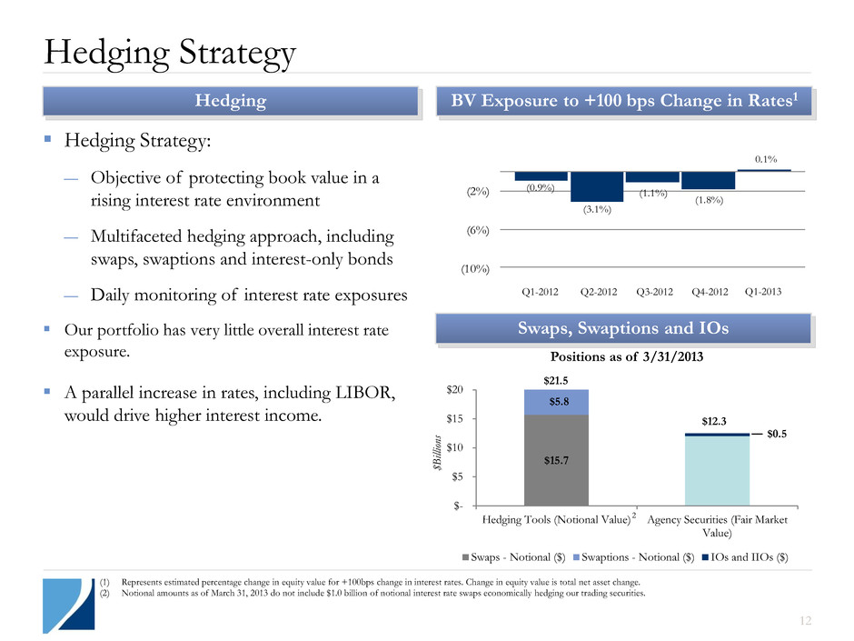 $15.7 $5.8 $0.5 $- $5 $10 $15 $20 Hedging Tools (Notional Value) Agency Securities (Fair Market Value) Swaps - Notional ($) Swaptions - Notional ($) IOs and IIOs ($) Hedging Strategy 12 Swaps, Swaptions and IOs BV Exposure to +100 bps Change in Rates1 Hedging Hedging Strategy: ― Objective of protecting book value in a rising interest rate environment ― Multifaceted hedging approach, including swaps, swaptions and interest-only bonds ― Daily monitoring of interest rate exposures Our portfolio has very little overall interest rate exposure. A parallel increase in rates, including LIBOR, would drive higher interest income. (1) Represents estimated percentage change in equity value for +100bps change in interest rates. Change in equity value is total net asset change. (2) Notional amounts as of March 31, 2013 do not include $1.0 billion of notional interest rate swaps economically hedging our trading securities. Q4-2012 Q3-2012 Q2-2012 Q1-2012 Q1-2013 $21.5 Positions as of 3/31/2013 $12.3 2 (0.9%) (3.1%) (1.1%) (1.8%) 0.1% (10%) (6%) (2%) $B ill io ns