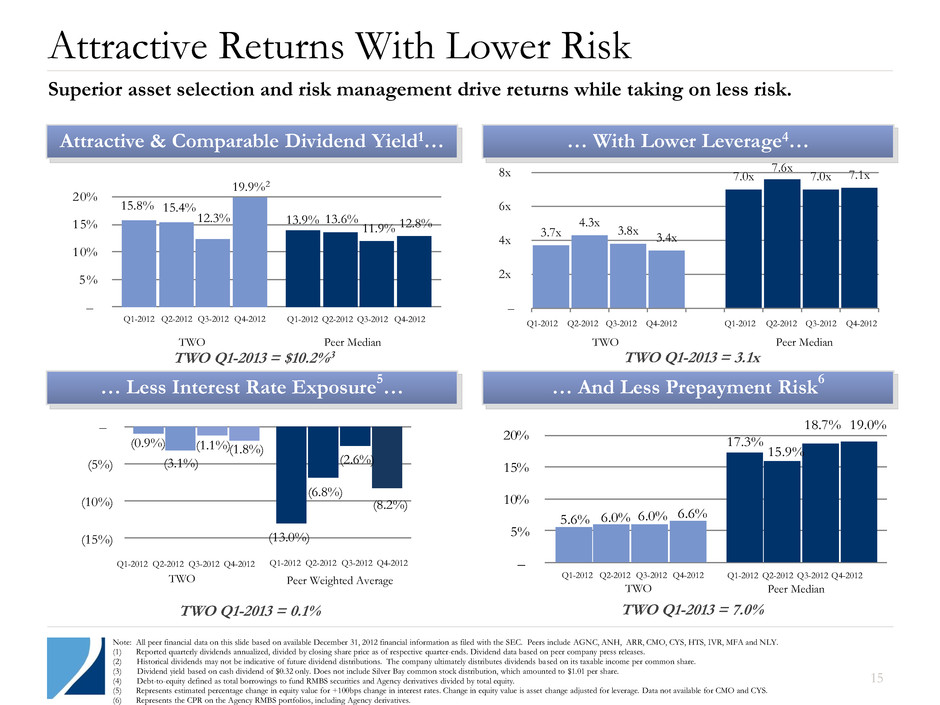 Attractive Returns With Lower Risk Attractive & Comparable Dividend Yield1… … With Lower Leverage4… … Less Interest Rate Exposure 5 … … And Less Prepayment Risk 6 5.6% 17.3% 6.0% 15.9% 6.0% 18.7% 6.6% 19.0% – 5% 10% 15% 20% 15.8% 13.9% 15.4% 13.6%12.3% 11.9% 19.9%2 12.8% – 5% 10% 15% 20% Note: All peer financial data on this slide based on available December 31, 2012 financial information as filed with the SEC. Peers include AGNC, ANH, ARR, CMO, CYS, HTS, IVR, MFA and NLY. (1) Reported quarterly dividends annualized, divided by closing share price as of respective quarter-ends. Dividend data based on peer company press releases. (2) Historical dividends may not be indicative of future dividend distributions. The company ultimately distributes dividends based on its taxable income per common share. (3) Dividend yield based on cash dividend of $0.32 only. Does not include Silver Bay common stock distribution, which amounted to $1.01 per share. (4) Debt-to-equity defined as total borrowings to fund RMBS securities and Agency derivatives divided by total equity. (5) Represents estimated percentage change in equity value for +100bps change in interest rates. Change in equity value is asset change adjusted for leverage. Data not available for CMO and CYS. (6) Represents the CPR on the Agency RMBS portfolios, including Agency derivatives. TWO Peer Median Superior asset selection and risk management drive returns while taking on less risk. Q1-2012 Q2-2012 Q3-2012 Q4-2012 Q1-2012 Q2-2012 Q3-2012 Q4-2012 Peer Median TWO (0.9%) (13.0%) (3.1%) (6.8%) ( .1 ) (2.6%) (1.8%) (8.2%) (15%) (10%) (5%) – TWO Peer Weighted Average Q1-2012 Q2-2012 Q3-2012 Q4-2012 Q1-2012 Q2-2012 Q3-2012 Q4-2012 Q1-2012 Q2-2012 Q3-2012 Q4-2012 Q1-2012 Q2-2012 Q3-2012 Q4-2012 Q1-2012 Q2-2012 Q3-2012 Q4-2012 Q1-2012 Q2-2012 Q3-2012 Q4-2012 15 3.7x 4.3x 3.8x 3.4x 7.0x 7.6x 7.0x 7.1x – 2x 4x 6x 8x TWO Peer Median TWO Q1-2013 = $10.2%3 TWO Q1-2013 = 3.1x TWO Q1-2013 = 0.1% TWO Q1-2013 = 7.0%