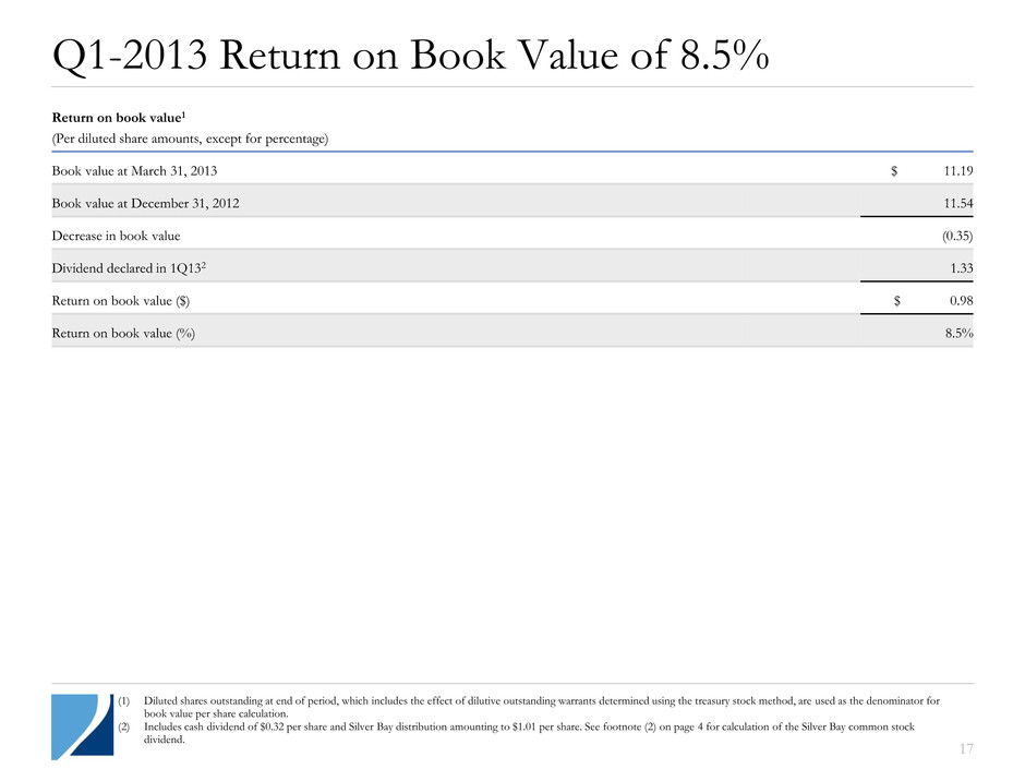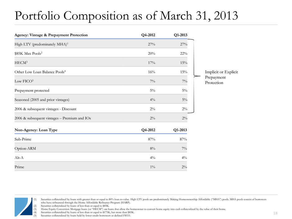 17 Q1-2013 Return on Book Value of 8.5% Return on book value1 (Per diluted share amounts, except for percentage) Book value at March 31, 2013 $ 11.19 Book value at December 31, 2012 11.54 Decrease in book value (0.35) Dividend declared in 1Q132 1.33 Return on book value ($) $ 0.98 Return on book value (%) 8.5% (1) Diluted shares outstanding at end of period, which includes the effect of dilutive outstanding warrants determined using the treasury stock method, are used as the denominator for book value per share calculation. (2) Includes cash dividend of $0.32 per share and Silver Bay distribution amounting to $1.01 per share. See footnote (2) on page 4 for calculation of the Silver Bay common stock dividend.