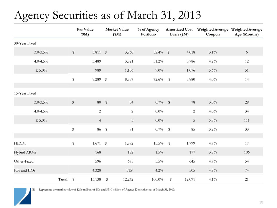 Agency: Vintage & Prepayment Protection Q4-2012 Q1-2013 High LTV (predominately MHA)1 27% 27% $85K Max Pools2 20% 22% HECM3 17% 15% Other Low Loan Balance Pools4 16% 15% Low FICO5 7% 7% Prepayment protected 5% 5% Seasoned (2005 and prior vintages) 4% 5% 2006 & subsequent vintages - Discount 2% 2% 2006 & subsequent vintages – Premium and IOs 2% 2% Portfolio Composition as of March 31, 2013 Implicit or Explicit Prepayment Protection Non-Agency: Loan Type Q4-2012 Q1-2013 Sub-Prime 87% 87% Option-ARM 8% 7% Alt-A 4% 4% Prime 1% 2% (1) Securities collateralized by loans with greater than or equal to 80% loan-to-value. High LTV pools are predominately Making Homeownership Affordable (“MHA”) pools. MHA pools consist of borrowers who have refinanced through the Home Affordable Refinance Program (HARP). (2) Securities collateralized by loans of less than or equal to $85K. (3) Home Equity Conversion Mortgage loans (or “HECM”) are loans that allow the homeowner to convert home equity into cash collateralized by the value of their home. (4) Securities collateralized by loans of less than or equal to $175K, but more than $85K. (5) Securities collateralized by loans held by lower credit borrowers as defined FICO. 18