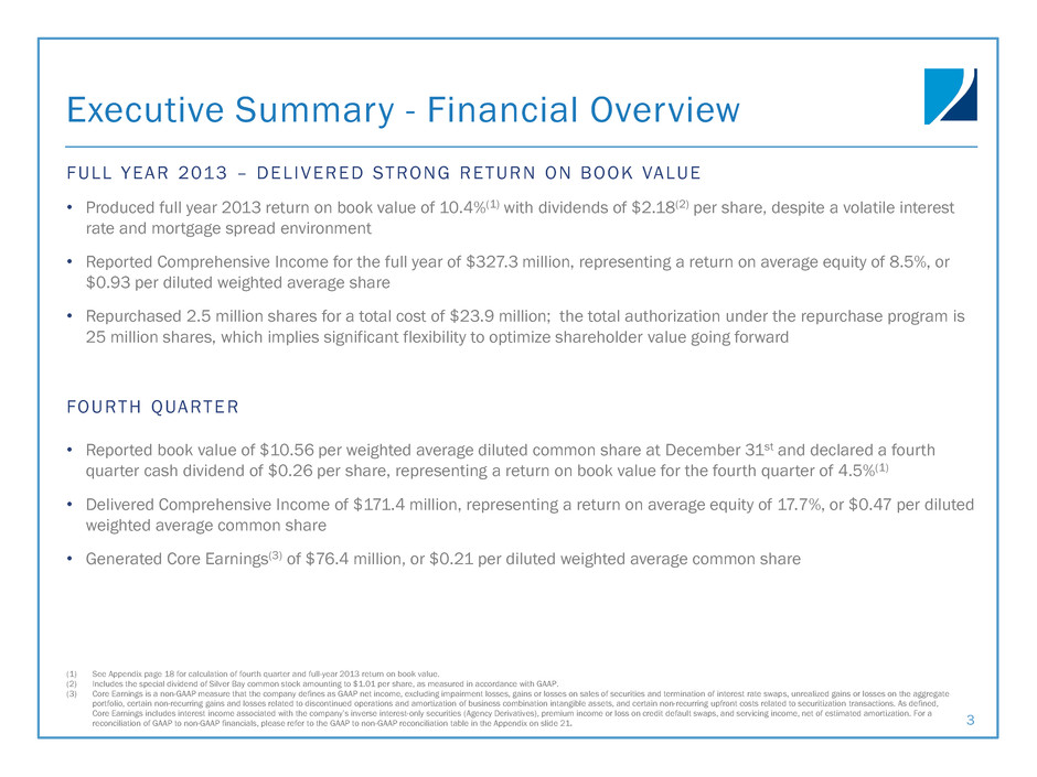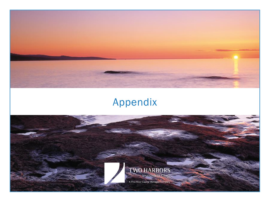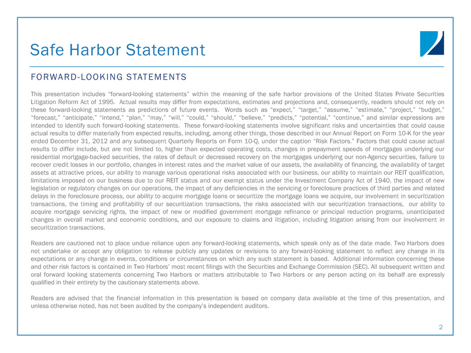 Safe Harbor Statement FORWARD-LOOKING STATEMENTS This presentation includes “forward-looking statements” within the meaning of the safe harbor provisions of the United States Private Securities Litigation Reform Act of 1995. Actual results may differ from expectations, estimates and projections and, consequently, readers should not rely on these forward-looking statements as predictions of future events. Words such as “expect,” “target,” “assume,” “estimate,” “project,” “budget,” “forecast,” “anticipate,” “intend,” “plan,” “may,” “will,” “could,” “should,” “believe,” “predicts,” “potential,” “continue,” and similar expressions are intended to identify such forward-looking statements. These forward-looking statements involve significant risks and uncertainties that could cause actual results to differ materially from expected results, including, among other things, those described in our Annual Report on Form 10-K for the year ended December 31, 2012 and any subsequent Quarterly Reports on Form 10-Q, under the caption “Risk Factors.” Factors that could cause actual results to differ include, but are not limited to, higher than expected operating costs, changes in prepayment speeds of mortgages underlying our residential mortgage-backed securities, the rates of default or decreased recovery on the mortgages underlying our non-Agency securities, failure to recover credit losses in our portfolio, changes in interest rates and the market value of our assets, the availability of financing, the availability of target assets at attractive prices, our ability to manage various operational risks associated with our business, our ability to maintain our REIT qualification, limitations imposed on our business due to our REIT status and our exempt status under the Investment Company Act of 1940, the impact of new legislation or regulatory changes on our operations, the impact of any deficiencies in the servicing or foreclosure practices of third parties and related delays in the foreclosure process, our ability to acquire mortgage loans or securitize the mortgage loans we acquire, our involvement in securitization transactions, the timing and profitability of our securitization transactions, the risks associated with our securitization transactions, our ability to acquire mortgage servicing rights, the impact of new or modified government mortgage refinance or principal reduction programs, unanticipated changes in overall market and economic conditions, and our exposure to claims and litigation, including litigation arising from our involvement in securitization transactions. Readers are cautioned not to place undue reliance upon any forward-looking statements, which speak only as of the date made. Two Harbors does not undertake or accept any obligation to release publicly any updates or revisions to any forward-looking statement to reflect any change in its expectations or any change in events, conditions or circumstances on which any such statement is based. Additional information concerning these and other risk factors is contained in Two Harbors’ most recent filings with the Securities and Exchange Commission (SEC). All subsequent written and oral forward looking statements concerning Two Harbors or matters attributable to Two Harbors or any person acting on its behalf are expressly qualified in their entirety by the cautionary statements above. Readers are advised that the financial information in this presentation is based on company data available at the time of this presentation, and unless otherwise noted, has not been audited by the company’s independent auditors. 2