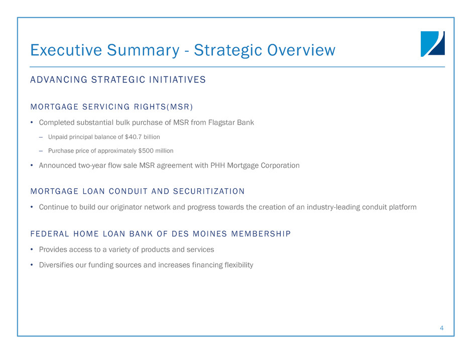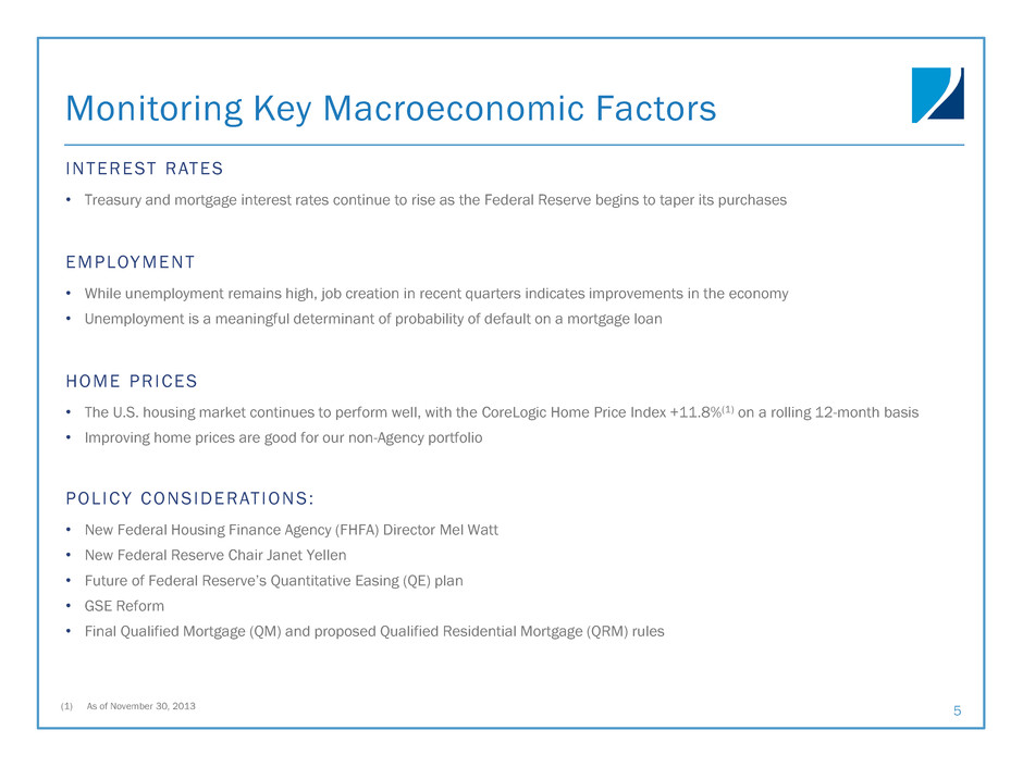 Executive Summary - Strategic Overview ADVANCING STRATEGIC INIT IATIVES MORTGAGE SERVIC ING RIGHTS(MSR) • Completed substantial bulk purchase of MSR from Flagstar Bank – Unpaid principal balance of $40.7 billion – Purchase price of approximately $500 million • Announced two-year flow sale MSR agreement with PHH Mortgage Corporation MORTGAGE LOAN CONDUIT AND SECURIT IZAT ION • Continue to build our originator network and progress towards the creation of an industry-leading conduit platform FEDERAL HOME LOAN BANK OF DES MOINES MEMBERSHIP • Provides access to a variety of products and services • Diversifies our funding sources and increases financing flexibility 4