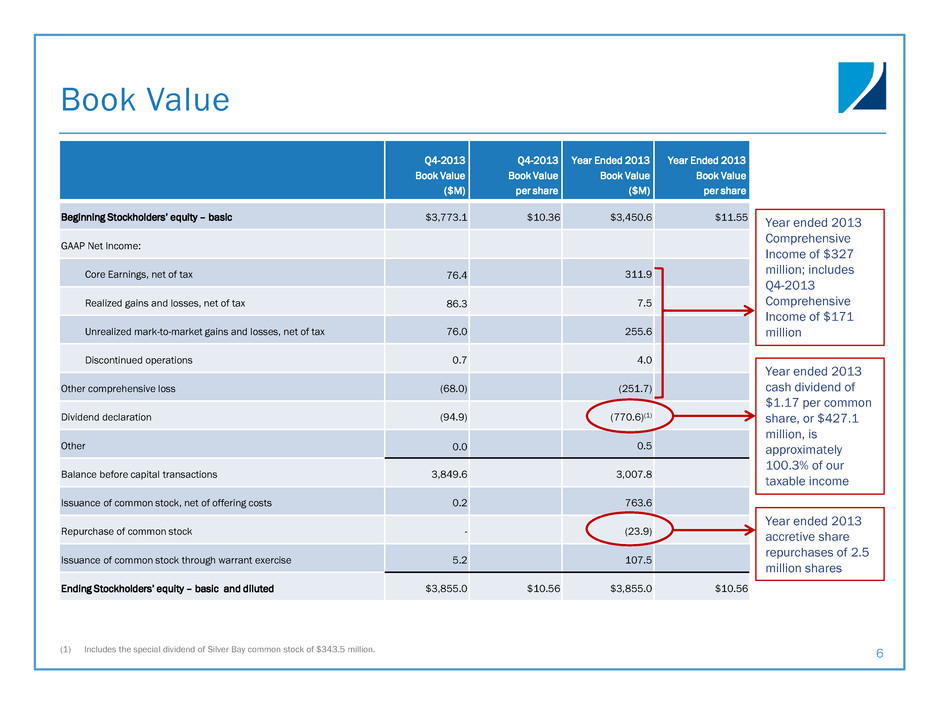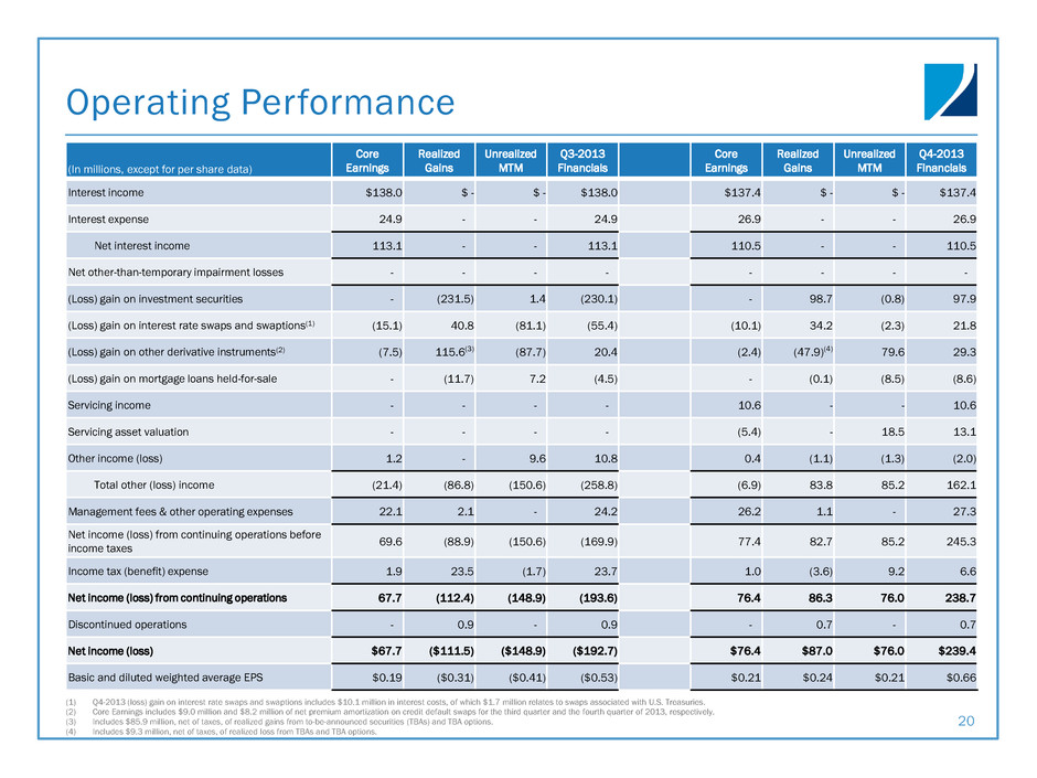 D I V I D E NDS (1 ) Portfolio Performance Summary 19 C O M P R E H E N S I V E I N C O M E BO O K VA LU E A N D D I V I DE ND (1 ) P E R S H A R E (2 ) G A A P N E T I N C O M E (1) Historical dividends may not be indicative of future dividend distributions. The company ultimately distributes dividends based on its taxable income per common share, not GAAP earnings. The annualized dividend yield on the company’s common stock is calculated based on the closing price of the last trading day of the relevant quarter. (2) Diluted shares outstanding at end of period, which includes the effect of dilutive outstanding warrants determined using the treasury stock method, are used as the denominator for book value per share calculation. (3) Includes cash dividend of $0.32 per share and the Silver Bay common stock distribution amounting to $1.01 per share, as measured in accordance with GAAP. (4) Dividend yield based on cash dividend of $0.32 per share only. Does not include Silver Bay common stock distribution. $185.4 $248.0 $(146.1) $54.0 $171.4 21.6% 26.9% (14.2%) 5.7% 17.7% -50.0% 0.0% 50.0% 100.0% $(300) $- $300 $600 Q4-2012 Q1-2013 Q2-2013 Q3-2013 Q4-2013 Comprehensive Income ($M) Comprehensive Income ROAE (%) $0.55 $0.32 $0.31 $0.28 $0.26 19.9% 10.2%(4) 12.1% 11.5% 11.2% 0.0% 5.0% 10.0% 15.0% 20.0% 25.0% $- $0.10 $0.20 $0.30 $0.40 $0.50 $0.60 Q4-2012 Q1-2013 Q2-2013 Q3-2013 Q4-2013 Dividend per Share ($) Dividend Yield (%) $189.3 $143.7 $388.6 ($192.7) $239.4 $0.64 $0.47 $1.06 $(0.53) $0.66 $(1.00) $(0.50) $- $0.50 $1.00 $1.50 $(300) $(200) $(100) $- $100 $200 $300 $400 Q4-2012 Q1-2013 Q2-2013 Q3-2013 Q4-2013 GAAP Net Income ($M) GAAP EPS ($) $11.54 $11.19 $10.47 $10.35 $10.56 $0.55 $1.33(3) $0.31 $0.28 $0.26 $8.00 $10.00 $12.00 Q4-2012 Q1-2013 Q2-2013 Q3-2013 Q4-2013 Book Value ($) Dividend declared ($)