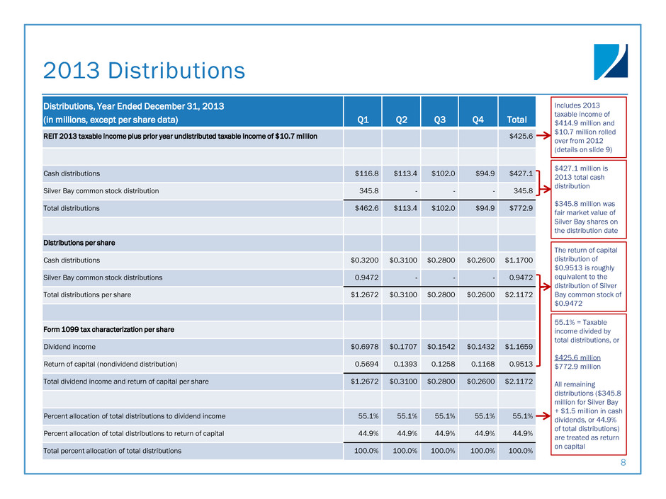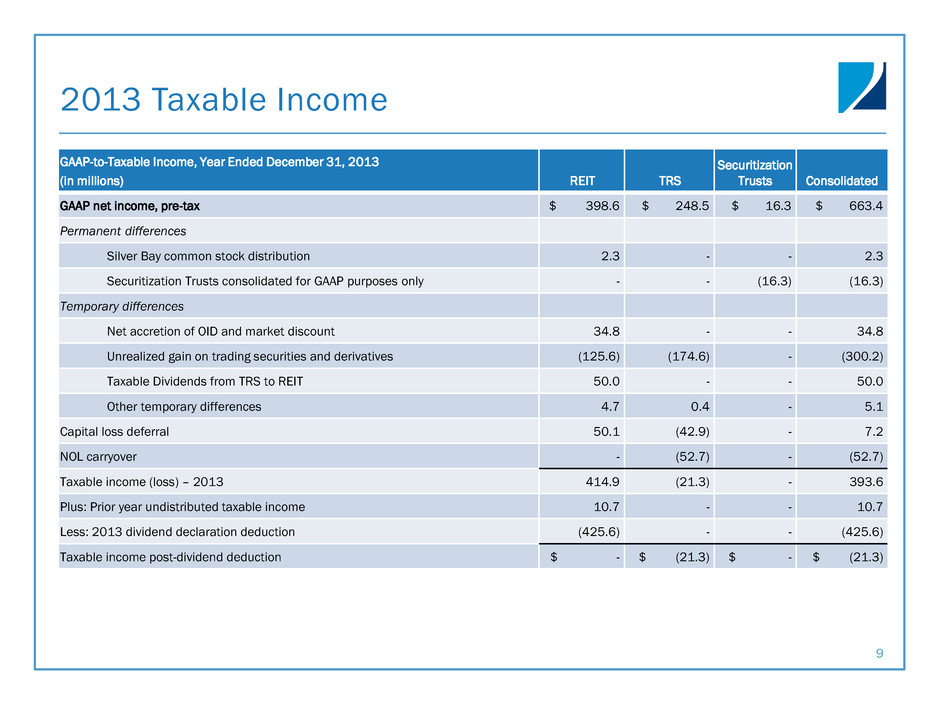 2013 Distributions 8 Distributions, Year Ended December 31, 2013 (in millions, except per share data) Q1 Q2 Q3 Q4 Total REIT 2013 taxable income plus prior year undistributed taxable income of $10.7 million $425.6 Cash distributions $116.8 $113.4 $102.0 $94.9 $427.1 Silver Bay common stock distribution 345.8 - - - 345.8 Total distributions $462.6 $113.4 $102.0 $94.9 $772.9 Distributions per share Cash distributions $0.3200 $0.3100 $0.2800 $0.2600 $1.1700 Silver Bay common stock distributions 0.9472 - - - 0.9472 Total distributions per share $1.2672 $0.3100 $0.2800 $0.2600 $2.1172 Form 1099 tax characterization per share Dividend income $0.6978 $0.1707 $0.1542 $0.1432 $1.1659 Return of capital (nondividend distribution) 0.5694 0.1393 0.1258 0.1168 0.9513 Total dividend income and return of capital per share $1.2672 $0.3100 $0.2800 $0.2600 $2.1172 Percent allocation of total distributions to dividend income 55.1% 55.1% 55.1% 55.1% 55.1% Percent allocation of total distributions to return of capital 44.9% 44.9% 44.9% 44.9% 44.9% Total percent allocation of total distributions 100.0% 100.0% 100.0% 100.0% 100.0% Includes 2013 taxable income of $414.9 million and $10.7 million rolled over from 2012 (details on slide 9) 55.1% = Taxable income divided by total distributions, or $425.6 million $772.9 million All remaining distributions ($345.8 million for Silver Bay + $1.5 million in cash dividends, or 44.9% of total distributions) are treated as return on capital The return of capital distribution of $0.9513 is roughly equivalent to the distribution of Silver Bay common stock of $0.9472 $427.1 million is 2013 total cash distribution $345.8 million was fair market value of Silver Bay shares on the distribution date