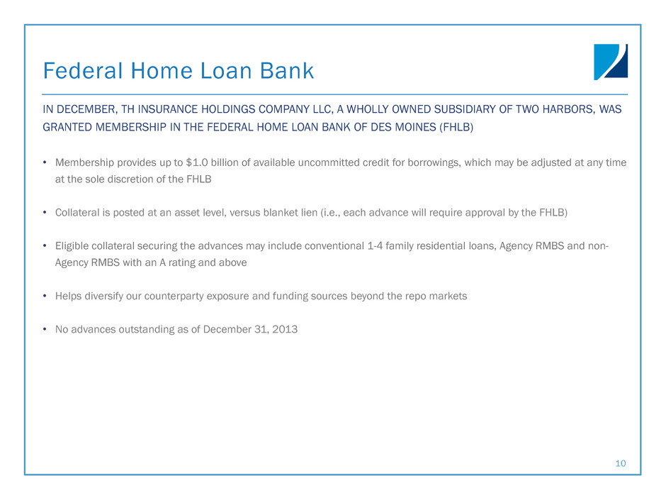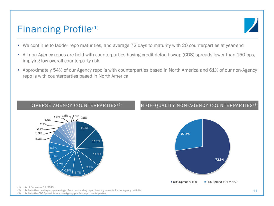 Federal Home Loan Bank IN DECEMBER, TH INSURANCE HOLDINGS COMPANY LLC, A WHOLLY OWNED SUBSIDIARY OF TWO HARBORS, WAS GRANTED MEMBERSHIP IN THE FEDERAL HOME LOAN BANK OF DES MOINES (FHLB) • Membership provides up to $1.0 billion of available uncommitted credit for borrowings, which may be adjusted at any time at the sole discretion of the FHLB • Collateral is posted at an asset level, versus blanket lien (i.e., each advance will require approval by the FHLB) • Eligible collateral securing the advances may include conventional 1-4 family residential loans, Agency RMBS and non- Agency RMBS with an A rating and above • Helps diversify our counterparty exposure and funding sources beyond the repo markets • No advances outstanding as of December 31, 2013 10