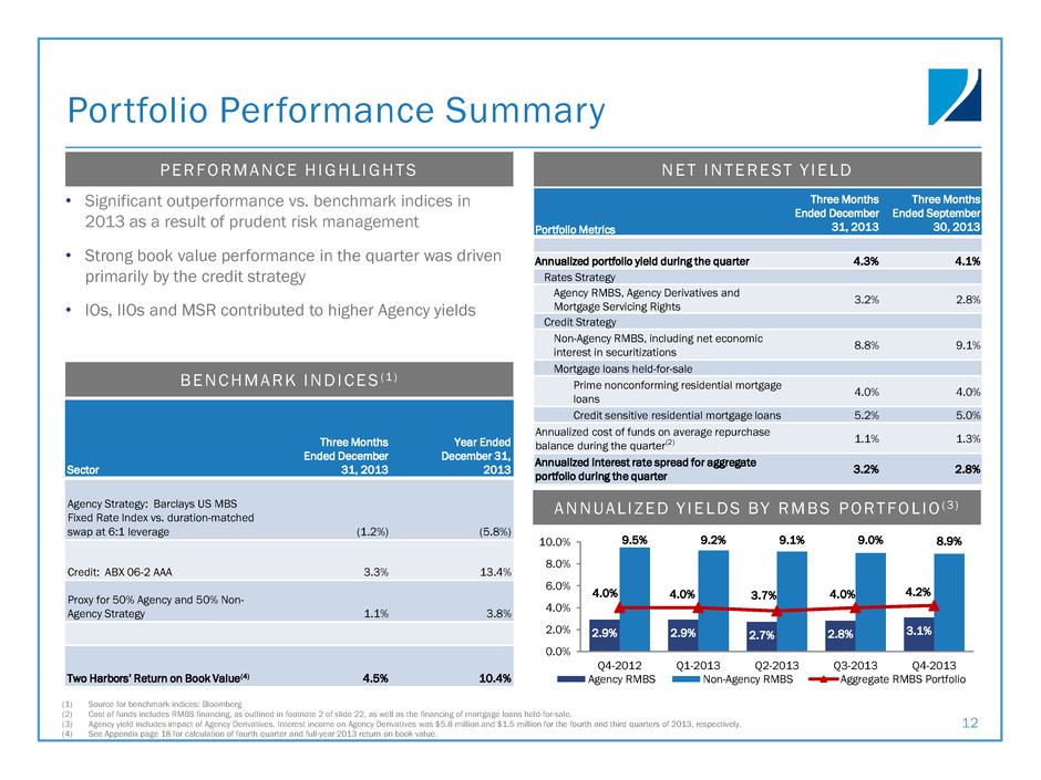 BE N C H M A R K I N D I C E S (1 ) Portfolio Performance Summary 12 P E R FO R M A NC E H I G H L I G H TS N E T I N T E R E ST Y I E L D A N N UAL I ZE D Y I E L D S BY R M BS P O RT FO L I O (3 ) (1) Source for benchmark indices: Bloomberg (2) Cost of funds includes RMBS financing, as outlined in footnote 2 of slide 22, as well as the financing of mortgage loans held-for-sale. (3) Agency yield includes impact of Agency Derivatives. Interest income on Agency Derivatives was $5.8 million and $1.5 million for the fourth and third quarters of 2013, respectively. (4) See Appendix page 18 for calculation of fourth quarter and full-year 2013 return on book value. Sector Three Months Ended December 31, 2013 Year Ended December 31, 2013 Agency Strategy: Barclays US MBS Fixed Rate Index vs. duration-matched swap at 6:1 leverage (1.2%) (5.8%) Credit: ABX 06-2 AAA 3.3% 13.4% Proxy for 50% Agency and 50% Non- Agency Strategy 1.1% 3.8% Two Harbors’ Return on Book Value(4) 4.5% 10.4% 2.9% 2.9% 2.7% 2.8% 3.1% 9.5% 9.2% 9.1% 9.0% 8.9% 4.0% 4.0% 3.7% 4.0% 4.2% 0.0% 2.0% 4.0% 6.0% 8.0% 10.0% Q4-2012 Q1-2013 Q2-2013 Q3-2013 Q4-2013 Agency RMBS Non-Agency RMBS Aggregate RMBS Portfolio • Significant outperformance vs. benchmark indices in 2013 as a result of prudent risk management • Strong book value performance in the quarter was driven primarily by the credit strategy • IOs, IIOs and MSR contributed to higher Agency yields Portfolio Metrics Three Months Ended December 31, 2013 Three Months Ended September 30, 2013 Annualized portfolio yield during the quarter 4.3% 4.1% Rates Strategy Agency RMBS, Agency Derivatives and Mortgage Servicing Rights 3.2% 2.8% Credit Strategy Non-Agency RMBS, including net economic interest in securitizations 8.8% 9.1% Mortgage loans held-for-sale Prime nonconforming residential mortgage loans 4.0% 4.0% Credit sensitive residential mortgage loans 5.2% 5.0% Annualized cost of funds on average repurchase balance during the quarter(2) 1.1% 1.3% Annualized interest rate spread for aggregate portfolio during the quarter 3.2% 2.8%