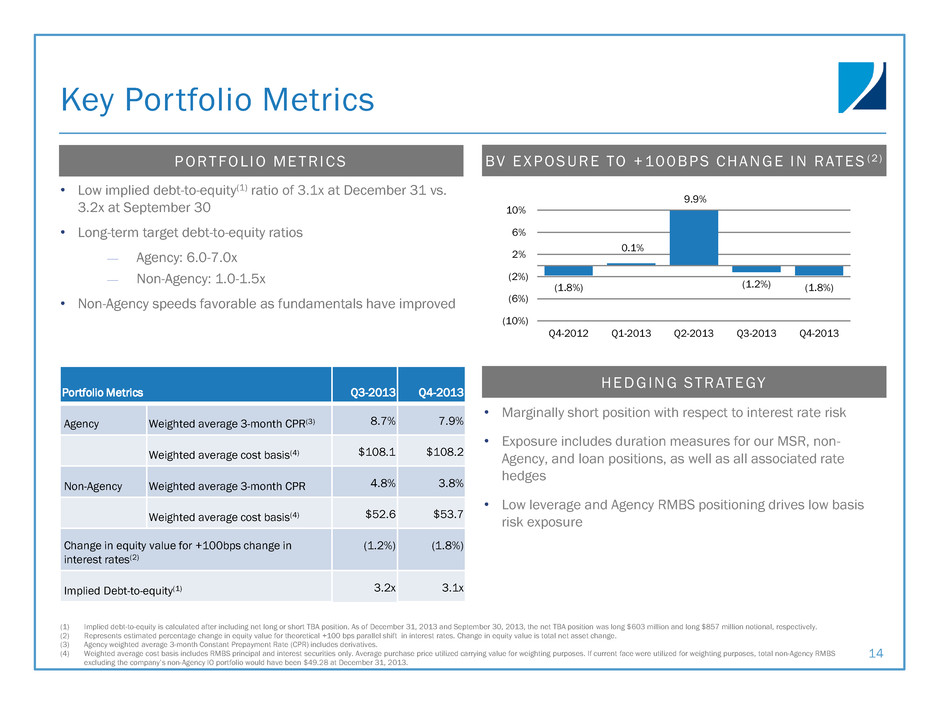 TA RG ET E D C A P I TAL A L LO C AT I O N H I G H L I G H TS P O RT FO L I O C O M P O S I T I O N Portfolio Composition 13 • Capital allocation at December 31, 2013 was 57% Rates(3) and 43% Credit(4) • Agencies declined to 44% of capital allocation while MSR increased to 13% at December 31st • Going forward, we expect our allocation to MSR to increase as we continue to build our operational platform Rates(3) $10.2B Credit(4) $3.5B AS OF DECEMBER 31, 2013 $13.7B Portfolio $ Millions 30-Year Fixed $5,649 15-Year Fixed $72 HECM(1) $1,793 Other-Fixed $720 IOs and IIOs(2) $475 Hybrid ARMs $1,007 Mezzanine $469 Senior $2,282 Other $281 CSLs $425 MSR $514 (1) Home Equity Conversion Mortgage loans (HECMs) are loans that allow the homeowner to convert home equity into cash collateralized by the value of their home. (2) Includes Agency Derivatives (IIOs) of $218.5 million. (3) Assets in the “Rates” category include Agency securities and MSR. (4) Assets in the “Credit” category include non-Agency securities, prime jumbo loans, net economic interest in securitization trusts and CSLs. 50% 60% 60% 55% 55% 52% 52% 57% 53% 52% 54% 55% 57% 40% 40% 45% 45% 48% 44% 36% 37% 38% 46% 45% 43% 4% 7% 10% 10% 0% 10% 20% 30% 40% 50% 60% 70% 4Q10 1Q11 2Q11 3Q11 4Q11 1Q12 2Q12 3Q12 4Q12 1Q13 2Q13 3Q13 4Q13 Rates Credit Residential Real Properties