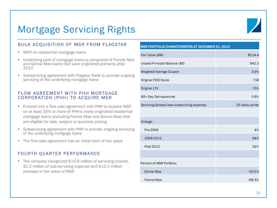 BV E X P O S U R E TO + 100BP S C H A N G E I N R AT E S (2 ) H E D G I N G ST R AT E GY P O RT FO L I O M E T R I C S Key Portfolio Metrics 14 • Low implied debt-to-equity(1) ratio of 3.1x at December 31 vs. 3.2x at September 30 • Long-term target debt-to-equity ratios ― Agency: 6.0-7.0x ― Non-Agency: 1.0-1.5x • Non-Agency speeds favorable as fundamentals have improved Portfolio Metrics Q3-2013 Q4-2013 Agency Weighted average 3-month CPR(3) 8.7% 7.9% Weighted average cost basis(4) $108.1 $108.2 Non-Agency Weighted average 3-month CPR 4.8% 3.8% Weighted average cost basis(4) $52.6 $53.7 Change in equity value for +100bps change in interest rates(2) (1.2%) (1.8%) Implied Debt-to-equity(1) 3.2x 3.1x • Marginally short position with respect to interest rate risk • Exposure includes duration measures for our MSR, non- Agency, and loan positions, as well as all associated rate hedges • Low leverage and Agency RMBS positioning drives low basis risk exposure (1) Implied debt-to-equity is calculated after including net long or short TBA position. As of December 31, 2013 and September 30, 2013, the net TBA position was long $603 million and long $857 million notional, respectively. (2) Represents estimated percentage change in equity value for theoretical +100 bps parallel shift in interest rates. Change in equity value is total net asset change. (3) Agency weighted average 3-month Constant Prepayment Rate (CPR) includes derivatives. (4) Weighted average cost basis includes RMBS principal and interest securities only. Average purchase price utilized carrying value for weighting purposes. If current face were utilized for weighting purposes, total non-Agency RMBS excluding the company’s non-Agency IO portfolio would have been $49.28 at December 31, 2013. (1.8%) 0.1% 9.9% (1.2%) (1.8%) (10%) (6%) (2%) 2% 6% 10% Q4-2012 Q1-2013 Q2-2013 Q3-2013 Q4-2013