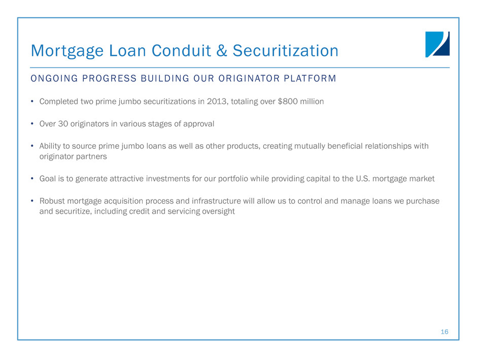 Mortgage Servicing Rights BU L K AC Q U IS IT IO N O F M S R F RO M F L AG STAR • MSR on residential mortgage loans • Underlying pool of mortgage loans is comprised of Fannie Mae and Ginnie Mae loans that were originated primarily after 2010 • Subservicing agreement with Flagstar Bank to provide ongoing servicing of the underlying mortgage loans F LOW AG R E E M E NT W I T H P H H M O RTG AG E C O R P O R AT I O N ( P H H ) TO AC Q U IR E M S R • Entered into a flow sale agreement with PHH to acquire MSR on at least 50% or more of PHH’s newly-originated residential mortgage loans (including Fannie Mae and Ginnie Mae) that are eligible for sale, subject to quarterly pricing • Subservicing agreement with PHH to provide ongoing servicing of the underlying mortgage loans • The flow sale agreement has an initial term of two years FO U RT H Q UA RT E R P E R FO R M A NC E • The company recognized $10.8 million of servicing income, $2.2 million of sub-servicing expense and $13.1 million increase in fair value of MSR 15 MSR PORTFOLIO CHARACTERISTICS AT DECEMBER 31, 2013 Fair Value ($M) $514.4 Unpaid Principal Balance ($B) $42.3 Weighted Average Coupon 3.9% Original FICO Score 734 Original LTV 75% 60+ Day Delinquencies 0.6% Servicing Spread (less subservicing expense) 25 basis points Vintage: Pre-2009 4% 2009-2012 64% Post 2012 32% Percent of MSR Portfolio: Ginnie Mae ~33.5% Fannie Mae ~66.3%