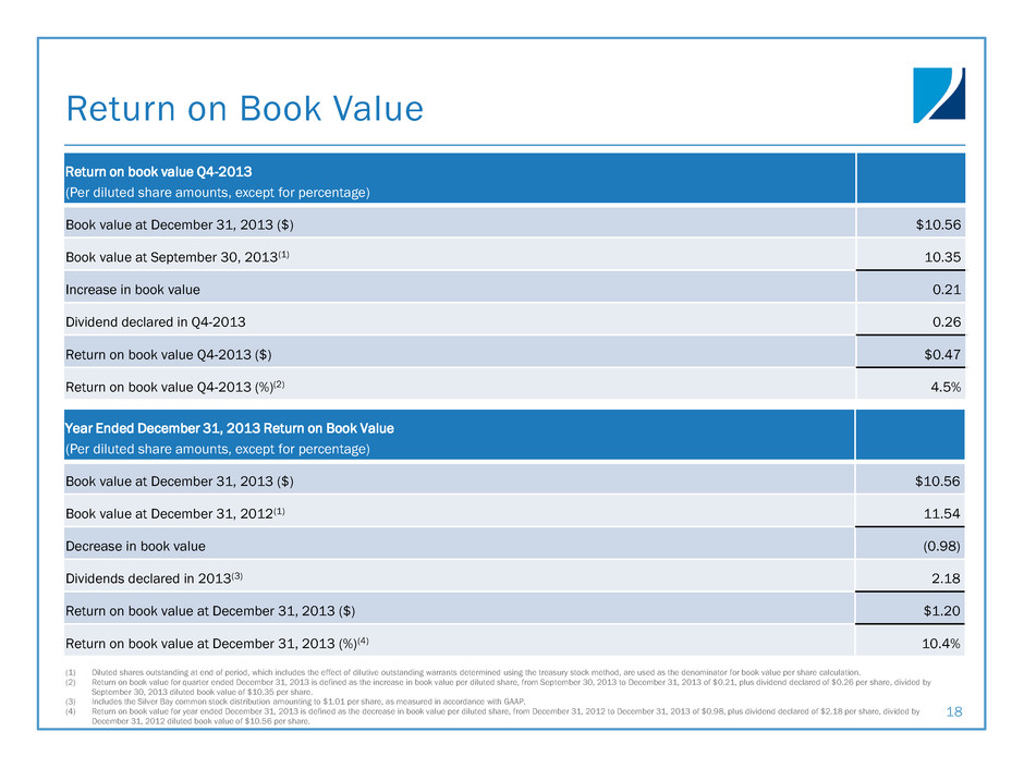 Executive Summary - Financial Overview FULL YEAR 2013 – DELIVERED STRONG RETURN ON BOOK VALUE • Produced full year 2013 return on book value of 10.4%(1) with dividends of $2.18(2) per share, despite a volatile interest rate and mortgage spread environment • Reported Comprehensive Income for the full year of $327.3 million, representing a return on average equity of 8.5%, or $0.93 per diluted weighted average share • Repurchased 2.5 million shares for a total cost of $23.9 million; the total authorization under the repurchase program is 25 million shares, which implies significant flexibility to optimize shareholder value going forward FOURTH QUARTER • Reported book value of $10.56 per weighted average diluted common share at December 31st and declared a fourth quarter cash dividend of $0.26 per share, representing a return on book value for the fourth quarter of 4.5%(1) • Delivered Comprehensive Income of $171.4 million, representing a return on average equity of 17.7%, or $0.47 per diluted weighted average common share • Generated Core Earnings(3) of $76.4 million, or $0.21 per diluted weighted average common share 3 (1) See Appendix page 18 for calculation of fourth quarter and full-year 2013 return on book value. (2) Includes the special dividend of Silver Bay common stock amounting to $1.01 per share, as measured in accordance with GAAP. (3) Core Earnings is a non-GAAP measure that the company defines as GAAP net income, excluding impairment losses, gains or losses on sales of securities and termination of interest rate swaps, unrealized gains or losses on the aggregate portfolio, certain non-recurring gains and losses related to discontinued operations and amortization of business combination intangible assets, and certain non-recurring upfront costs related to securitization transactions. As defined, Core Earnings includes interest income associated with the company’s inverse interest-only securities (Agency Derivatives), premium income or loss on credit default swaps, and servicing income, net of estimated amortization. For a reconciliation of GAAP to non-GAAP financials, please refer to the GAAP to non-GAAP reconciliation table in the Appendix on slide 21.