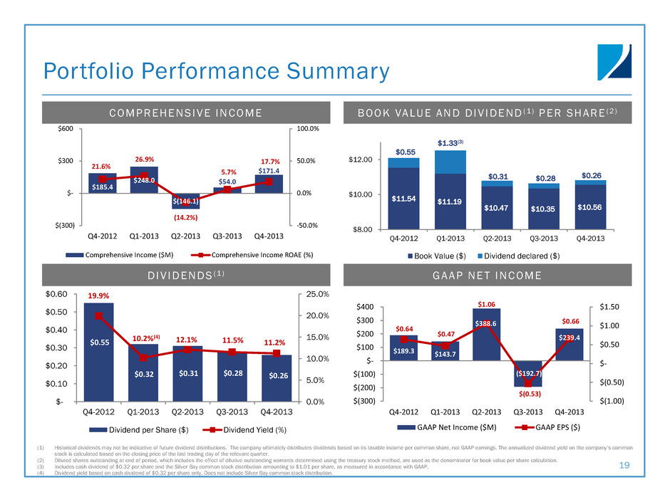 Return on Book Value 18 Return on book value Q4-2013 (Per diluted share amounts, except for percentage) Book value at December 31, 2013 ($) $10.56 Book value at September 30, 2013(1) 10.35 Increase in book value 0.21 Dividend declared in Q4-2013 0.26 Return on book value Q4-2013 ($) $0.47 Return on book value Q4-2013 (%)(2) 4.5% Year Ended December 31, 2013 Return on Book Value (Per diluted share amounts, except for percentage) Book value at December 31, 2013 ($) $10.56 Book value at December 31, 2012(1) 11.54 Decrease in book value (0.98) Dividends declared in 2013(3) 2.18 Return on book value at December 31, 2013 ($) $1.20 Return on book value at December 31, 2013 (%)(4) 10.4% (1) Diluted shares outstanding at end of period, which includes the effect of dilutive outstanding warrants determined using the treasury stock method, are used as the denominator for book value per share calculation. (2) Return on book value for quarter ended December 31, 2013 is defined as the increase in book value per diluted share, from September 30, 2013 to December 31, 2013 of $0.21, plus dividend declared of $0.26 per share, divided by September 30, 2013 diluted book value of $10.35 per share. (3) Includes the Silver Bay common stock distribution amounting to $1.01 per share, as measured in accordance with GAAP. (4) Return on book value for year ended December 31, 2013 is defined as the decrease in book value per diluted share, from December 31, 2012 to December 31, 2013 of $0.98, plus dividend declared of $2.18 per share, divided by December 31, 2012 diluted book value of $10.56 per share.