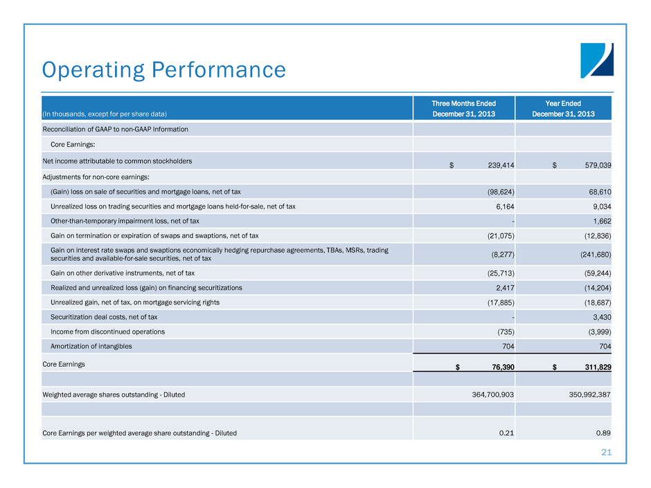 Operating Performance 20 (In millions, except for per share data) Core Earnings Realized Gains Unrealized MTM Q3-2013 Financials Core Earnings Realized Gains Unrealized MTM Q4-2013 Financials Interest income $138.0 $ - $ - $138.0 $137.4 $ - $ - $137.4 Interest expense 24.9 - - 24.9 26.9 - - 26.9 Net interest income 113.1 - - 113.1 110.5 - - 110.5 Net other-than-temporary impairment losses - - - - - - - - (Loss) gain on investment securities - (231.5) 1.4 (230.1) - 98.7 (0.8) 97.9 (Loss) gain on interest rate swaps and swaptions(1) (15.1) 40.8 (81.1) (55.4) (10.1) 34.2 (2.3) 21.8 (Loss) gain on other derivative instruments(2) (7.5) 115.6(3) (87.7) 20.4 (2.4) (47.9)(4) 79.6 29.3 (Loss) gain on mortgage loans held-for-sale - (11.7) 7.2 (4.5) - (0.1) (8.5) (8.6) Servicing income - - - - 10.6 - - 10.6 Servicing asset valuation - - - - (5.4) - 18.5 13.1 Other income (loss) 1.2 - 9.6 10.8 0.4 (1.1) (1.3) (2.0) Total other (loss) income (21.4) (86.8) (150.6) (258.8) (6.9) 83.8 85.2 162.1 Management fees & other operating expenses 22.1 2.1 - 24.2 26.2 1.1 - 27.3 Net income (loss) from continuing operations before income taxes 69.6 (88.9) (150.6) (169.9) 77.4 82.7 85.2 245.3 Income tax (benefit) expense 1.9 23.5 (1.7) 23.7 1.0 (3.6) 9.2 6.6 Net income (loss) from continuing operations 67.7 (112.4) (148.9) (193.6) 76.4 86.3 76.0 238.7 Discontinued operations - 0.9 - 0.9 - 0.7 - 0.7 Net income (loss) $67.7 ($111.5) ($148.9) ($192.7) $76.4 $87.0 $76.0 $239.4 Basic and diluted weighted average EPS $0.19 ($0.31) ($0.41) ($0.53) $0.21 $0.24 $0.21 $0.66 (1) Q4-2013 (loss) gain on interest rate swaps and swaptions includes $10.1 million in interest costs, of which $1.7 million relates to swaps associated with U.S. Treasuries. (2) Core Earnings includes $9.0 million and $8.2 million of net premium amortization on credit default swaps for the third quarter and the fourth quarter of 2013, respectively. (3) Includes $85.9 million, net of taxes, of realized gains from to-be-announced securities (TBAs) and TBA options. (4) Includes $9.3 million, net of taxes, of realized loss from TBAs and TBA options.