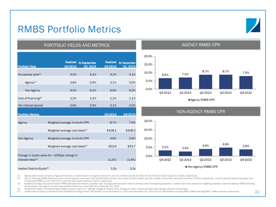 Operating Performance 21 (In thousands, except for per share data) Three Months Ended December 31, 2013 Year Ended December 31, 2013 Reconciliation of GAAP to non-GAAP Information Core Earnings: Net income attributable to common stockholders $ 239,414 $ 579,039 Adjustments for non-core earnings: (Gain) loss on sale of securities and mortgage loans, net of tax (98,624) 68,610 Unrealized loss on trading securities and mortgage loans held-for-sale, net of tax 6,164 9,034 Other-than-temporary impairment loss, net of tax - 1,662 Gain on termination or expiration of swaps and swaptions, net of tax (21,075) (12,836) Gain on interest rate swaps and swaptions economically hedging repurchase agreements, TBAs, MSRs, trading securities and available-for-sale securities, net of tax (8,277) (241,680) Gain on other derivative instruments, net of tax (25,713) (59,244) Realized and unrealized loss (gain) on financing securitizations 2,417 (14,204) Unrealized gain, net of tax, on mortgage servicing rights (17,885) (18,687) Securitization deal costs, net of tax - 3,430 Income from discontinued operations (735) (3,999) Amortization of intangibles 704 704 Core Earnings $ 76,390 $ 311,829 Weighted average shares outstanding - Diluted 364,700,903 350,992,387 Core Earnings per weighted average share outstanding - Diluted 0.21 0.89