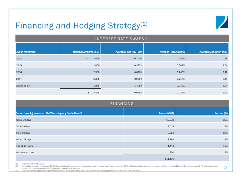 RMBS Portfolio Metrics 22 AGENCY RMBS CPR PORTFOLIO YIELDS AND METRICS (1) Agency yield includes impact of Agency Derivatives. Interest income on Agency Derivatives was $1.5 million and $5.8 million for the third and fourth quarters of 2013, respectively. (2) Cost of financing RMBS includes interest spread expense associated with the portfolio’s interest rate swaps of $14.0 million and $9.2 million for the third and fourth quarters of 2013, respectively. Interest spread expense increased cost of financing RMBS by 0.5% and 0.3% in the third and fourth quarters of 2013, respectively. (3) Weighted average cost basis includes RMBS principal and interest securities only. Average purchase price utilized carrying value for weighting purposes. If current face were utilized for weighting purposes, total non-Agency RMBS excluding the company’s non-Agency interest-only portfolio would have been $49.28 at December 31, 2013. (4) Represents range of the percentage change in equity value for + 100 bps change in interest rates. Change in equity value is portfolio value change adjusted for leverage. (5) Implied debt-to-equity is calculated after including net long or short TBA position. As of December 31, 2013 and September 30, 2013, the net TBA position was long $603 million and long $857 million notional, respectively. Portfolio Yield Realized Q3-2013 At September 30, 2013 Realized Q4-2013 At December 31, 2013 Annualized yield(1) 4.0% 4.1% 4.2% 4.1% Agency(1) 2.8% 2.9% 3.1% 3.0% Non-Agency 9.0% 9.0% 8.9% 9.0% Cost of financing(2) 1.2% 1.2% 1.1% 1.1% Net interest spread 2.8% 2.9% 3.1% 3.0% Portfolio Metrics Q3-2013 Q4-2013 Agency Weighted average 3-month CPR 8.7% 7.9% Weighted average cost basis(3) $108.1 $108.2 Non-Agency Weighted average 3-month CPR 4.8% 3.8% Weighted average cost basis(3) $52.6 $53.7 Change in equity value for +100bps change in interest rates(4) (1.2%) (1.8%) Implied Debt-to-Equity(5) 3.2x 3.1x NON-AGENCY RMBS CPR 3.2% 2.6% 4.0% 4.8% 3.8% 0.0% 5.0% 10.0% 15.0% 20.0% Q4-2012 Q1-2013 Q2-2013 Q3-2013 Q4-2013 Non-Agency RMBS CPR 6.6% 7.0% 8.7% 8.7% 7.9% 0.0% 5.0% 10.0% 15.0% 20.0% Q4-2012 Q1-2013 Q2-2013 Q3-2013 Q4-2013 Agency RMBS CPR