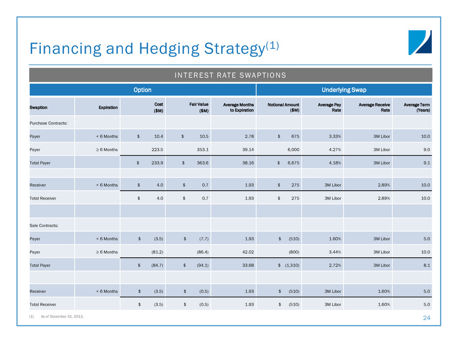I N T E R E ST R AT E SWA P T I O NS Financing and Hedging Strategy(1) 24 (1) As of December 31, 2013. Option Underlying Swap Swaption Expiration Cost ($M) Fair Value ($M) Average Months to Expiration Notional Amount ($M) Average Pay Rate Average Receive Rate Average Term (Years) Purchase Contracts: Payer < 6 Months $ 10.4 $ 10.5 2.78 $ 675 3.33% 3M Libor 10.0 Payer ≥ 6 Months 223.5 353.1 39.14 6,000 4.27% 3M Libor 9.0 Total Payer $ 233.9 $ 363.6 38.16 $ 6,675 4.18% 3M Libor 9.1 Receiver < 6 Months $ 4.0 $ 0.7 1.93 $ 275 3M Libor 2.89% 10.0 Total Receiver $ 4.0 $ 0.7 1.93 $ 275 3M Libor 2.89% 10.0 Sale Contracts: Payer < 6 Months $ (3.5) $ (7.7) 1.93 $ (510) 1.60% 3M Libor 5.0 Payer ≥ 6 Months (81.2) (86.4) 42.02 (800) 3.44% 3M Libor 10.0 Total Payer $ (84.7) $ (94.1) 33.68 $ (1,310) 2.72% 3M Libor 8.1 Receiver < 6 Months $ (3.5) $ (0.5) 1.93 $ (510) 3M Libor 1.60% 5.0 Total Receiver $ (3.5) $ (0.5) 1.93 $ (510) 3M Libor 1.60% 5.0