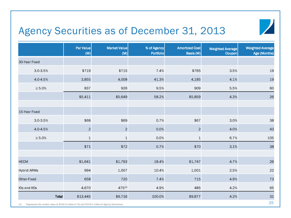 I N T E R E ST R AT E SWA P S (2 ) F I N A NC ING Financing and Hedging Strategy(1) 23 (1) As of December 31, 2013. (2) Notional amounts do not include $1.0 billion of notional interest rate swaps economically hedging our trading securities, $3.1 billion of notional interest rate swaps hedging our available-for-sale securities, and $1.1 billion of notional interest rate swaps economically hedging our TBA contracts and MSR. (3) Does not include repurchase agreements collateralized by U.S. Treasuries of $1.0 billion and mortgage loans held-for-sale of $147.3 million. Swaps Maturities Notional Amounts ($M) Average Fixed Pay Rate Average Receive Rate Average Maturity (Years) 2014 $ 3,900 0.300% 0.245% 0.76 2015 1,000 0.383% 0.244% 1.04 2016 2,950 0.626% 0.246% 2.42 2017 5,300 0.920% 0.217% 3.49 2018 and after 1,275 1.406% 0.242% 5.04 $ 14,425 0.698% 0.235% 2.50 Repurchase Agreements: RMBS and Agency Derivatives(3) Amount ($M) Percent (%) Within 30 days $3,832 35% 30 to 59 days 2,014 18% 60 to 89 days 2,226 20% 90 to 119 days 1,386 12% 120 to 364 days 1,448 13% One year and over 200 2% $11,106