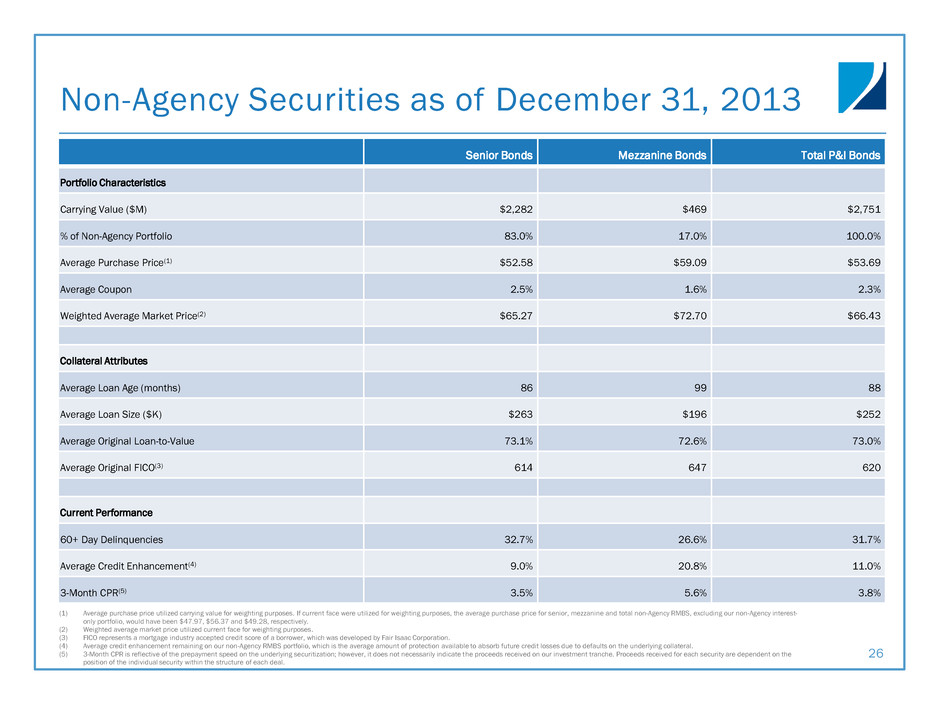 Agency Securities as of December 31, 2013 25 Par Value (M) Market Value (M) % of Agency Portfolio Amortized Cost Basis (M) Weighted Average Coupon Weighted Average Age (Months) 30-Year Fixed 3.0-3.5% $719 $715 7.4% $765 3.5% 19 4.0-4.5% 3,855 4,008 41.3% 4,185 4.1% 19 ≥ 5.0% 837 926 9.5% 909 5.5% 60 $5,411 $5,649 58.2% $5,859 4.3% 26 15-Year Fixed 3.0-3.5% $68 $69 0.7% $67 3.0% 38 4.0-4.5% 2 2 0.0% 2 4.0% 43 ≥ 5.0% 1 1 0.0% 1 6.7% 105 $71 $72 0.7% $70 3.1% 38 HECM $1,641 $1,793 18.4% $1,747 4.7% 26 Hybrid ARMs 994 1,007 10.4% 1,001 2.5% 22 Other-Fixed 658 720 7.4% 715 4.9% 73 IOs and IIOs 4,670 475(1) 4.9% 485 4.2% 65 Total $13,445 $9,716 100.0% $9,877 4.2% 31 (1) Represents the market value of $256.4 million of IOs and $218.5 million of Agency Derivatives.