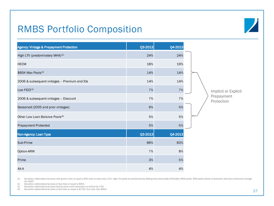 Non-Agency Securities as of December 31, 2013 26 Senior Bonds Mezzanine Bonds Total P&I Bonds Portfolio Characteristics Carrying Value ($M) $2,282 $469 $2,751 % of Non-Agency Portfolio 83.0% 17.0% 100.0% Average Purchase Price(1) $52.58 $59.09 $53.69 Average Coupon 2.5% 1.6% 2.3% Weighted Average Market Price(2) $65.27 $72.70 $66.43 Collateral Attributes Average Loan Age (months) 86 99 88 Average Loan Size ($K) $263 $196 $252 Average Original Loan-to-Value 73.1% 72.6% 73.0% Average Original FICO(3) 614 647 620 Current Performance 60+ Day Delinquencies 32.7% 26.6% 31.7% Average Credit Enhancement(4) 9.0% 20.8% 11.0% 3-Month CPR(5) 3.5% 5.6% 3.8% (1) Average purchase price utilized carrying value for weighting purposes. If current face were utilized for weighting purposes, the average purchase price for senior, mezzanine and total non-Agency RMBS, excluding our non-Agency interest- only portfolio, would have been $47.97, $56.37 and $49.28, respectively. (2) Weighted average market price utilized current face for weighting purposes. (3) FICO represents a mortgage industry accepted credit score of a borrower, which was developed by Fair Isaac Corporation. (4) Average credit enhancement remaining on our non-Agency RMBS portfolio, which is the average amount of protection available to absorb future credit losses due to defaults on the underlying collateral. (5) 3-Month CPR is reflective of the prepayment speed on the underlying securitization; however, it does not necessarily indicate the proceeds received on our investment tranche. Proceeds received for each security are dependent on the position of the individual security within the structure of each deal.