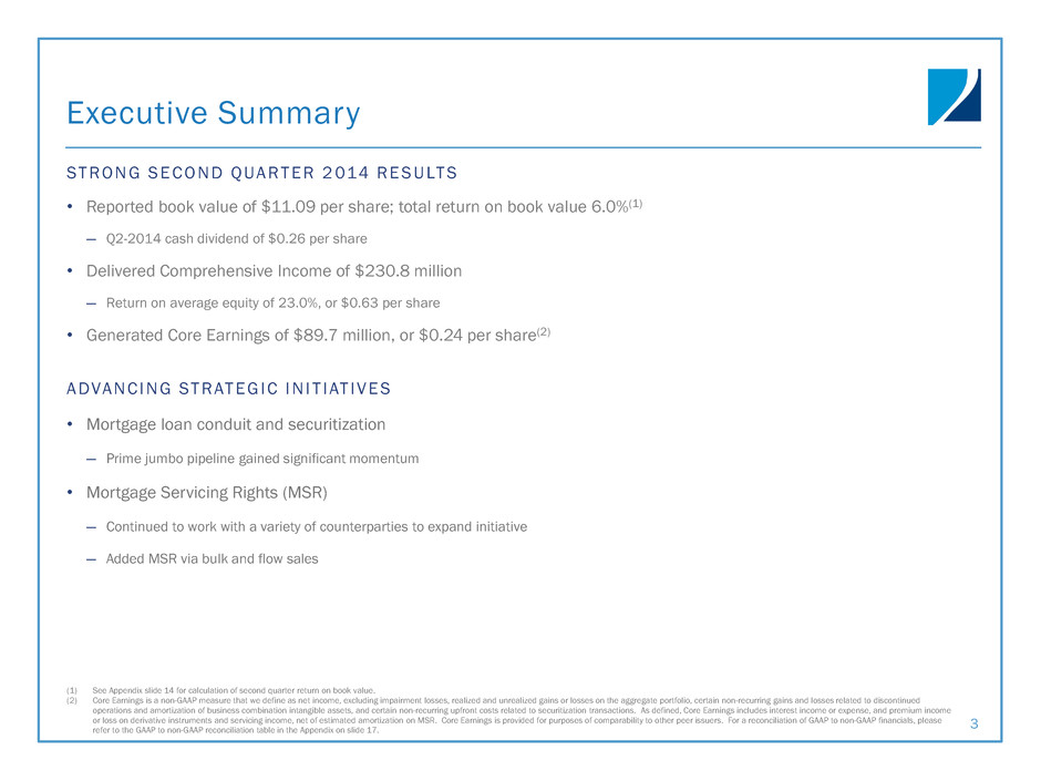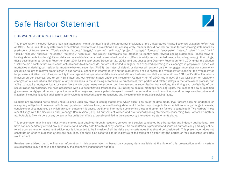 Safe Harbor Statement F O R W A R D - L O O K I N G S T A T E M EN T S This presentation includes “forward-looking statements” within the meaning of the safe harbor provisions of the United States Private Securities Litigation Reform Act of 1995. Actual results may differ from expectations, estimates and projections and, consequently, readers should not rely on these forward-looking statements as predictions of future events. Words such as “expect,” “target,” “assume,” “estimate,” “project,” “budget,” “forecast,” “anticipate,” “intend,” “plan,” “may,” “will,” “could,” “should,” “believe,” “predicts,” “potential,” “continue,” and similar expressions are intended to identify such forward-looking statements. These forward- looking statements involve significant risks and uncertainties that could cause actual results to differ materially from expected results, including, among other things, those described in our Annual Report on Form 10-K for the year ended December 31, 2013, and any subsequent Quarterly Reports on form 10-Q, under the caption “Risk Factors.” Factors that could cause actual results to differ include, but are not limited to, higher than expected operating costs, changes in prepayment speeds of mortgages underlying our residential mortgage-backed securities (RMBS), the rates of default or decreased recovery on the mortgages underlying our non-Agency securities, failure to recover credit losses in our portfolio, changes in interest rates and the market value of our assets, the availability of financing, the availability of target assets at attractive prices, our ability to manage various operational risks associated with our business, our ability to maintain our REIT qualification, limitations imposed on our business due to our REIT status and our exempt status under the Investment Company Act of 1940, the impact of new legislation or regulatory changes on our operations, the impact of any deficiencies in the servicing or foreclosure practices of third parties and related delays in the foreclosure process, our ability to acquire mortgage loans or securitize the mortgage loans we acquire, our involvement in securitization transactions, the timing and profitability of our securitization transactions, the risks associated with our securitization transactions, our ability to acquire mortgage servicing rights, the impact of new or modified government mortgage refinance or principal reduction programs, unanticipated changes in overall market and economic conditions, and our exposure to claims and litigation, including litigation arising from our involvement in securitization transactions and investments in mortgage servicing rights. Readers are cautioned not to place undue reliance upon any forward-looking statements, which speak only as of the date made. Two Harbors does not undertake or accept any obligation to release publicly any updates or revisions to any forward-looking statement to reflect any change in its expectations or any change in events, conditions or circumstances on which any such statement is based. Additional information concerning these and other risk factors is contained in Two Harbors’ most recent filings with the Securities and Exchange Commission (SEC). All subsequent written and oral forward-looking statements concerning Two Harbors or matters attributable to Two Harbors or any person acting on its behalf are expressly qualified in their entirety by the cautionary statements above. This presentation may include industry and market data obtained through research, surveys, and studies conducted by third parties and industry publications. We have not independently verified any such market and industry data from third-party sources. This presentation is provided for discussion purposes only and may not be relied upon as legal or investment advice, nor is it intended to be inclusive of all the risks and uncertainties that should be considered. This presentation does not constitute an offer to purchase or sell any securities, nor shall it be construed to be indicative of the terms of an offer that the parties or their respective affiliates would accept. Readers are advised that the financial information in this presentation is based on company data available at the time of this presentation and, in certain circumstances, may not have been audited by the company’s independent auditors. 2