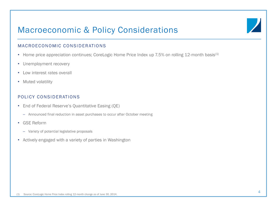 Executive Summary ST RO N G S E C O N D Q UA RT E R 2 014 R E S U LT S • Reported book value of $11.09 per share; total return on book value 6.0%(1) — Q2-2014 cash dividend of $0.26 per share • Delivered Comprehensive Income of $230.8 million — Return on average equity of 23.0%, or $0.63 per share • Generated Core Earnings of $89.7 million, or $0.24 per share(2) A DVANC I NG ST R AT E G IC I N I T I AT IV E S • Mortgage loan conduit and securitization — Prime jumbo pipeline gained significant momentum • Mortgage Servicing Rights (MSR) — Continued to work with a variety of counterparties to expand initiative — Added MSR via bulk and flow sales 3 (1) See Appendix slide 14 for calculation of second quarter return on book value. (2) Core Earnings is a non-GAAP measure that we define as net income, excluding impairment losses, realized and unrealized gains or losses on the aggregate portfolio, certain non-recurring gains and losses related to discontinued operations and amortization of business combination intangible assets, and certain non-recurring upfront costs related to securitization transactions. As defined, Core Earnings includes interest income or expense, and premium income or loss on derivative instruments and servicing income, net of estimated amortization on MSR. Core Earnings is provided for purposes of comparability to other peer issuers. For a reconciliation of GAAP to non-GAAP financials, please refer to the GAAP to non-GAAP reconciliation table in the Appendix on slide 17.